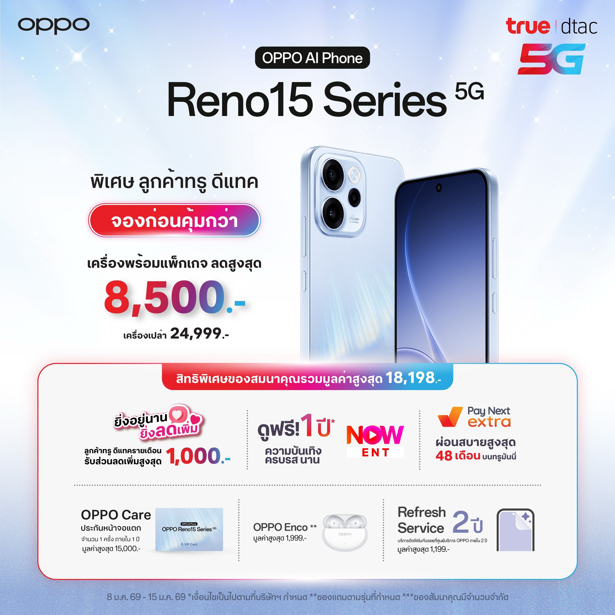 โดย OPPO Reno15 Series 5G พร้อมเป็นผู้นำด้านการถ่ายภาพพอร์ตเทรต อัปเกรดประสบการณ์ถ่ายพอร์ตเทรต และวิดีโอที่ล้ำขึ้นกว่าเดิม ด้วยราคาสุดพิเศษจากกลุ่มทรู เริ่มต้นเพียง 7,499 บาทต่อเดือน ตั้งแต่วันนี้ ถึง 15 มกราคม 2569 ที่ทรูช็อป, ทรูช็อปใน 7-Eleven, ทรูพาร์ทเนอร์ทั่วประเทศ หรือสั่งผ่านช่องทางออนไลน์ส่งฟรีถึงบ้านได้ที่ True Store และ LINE @TrueStore และ ศูนย์บริการดีแทคทั่วประเทศ หรือ dtac online store