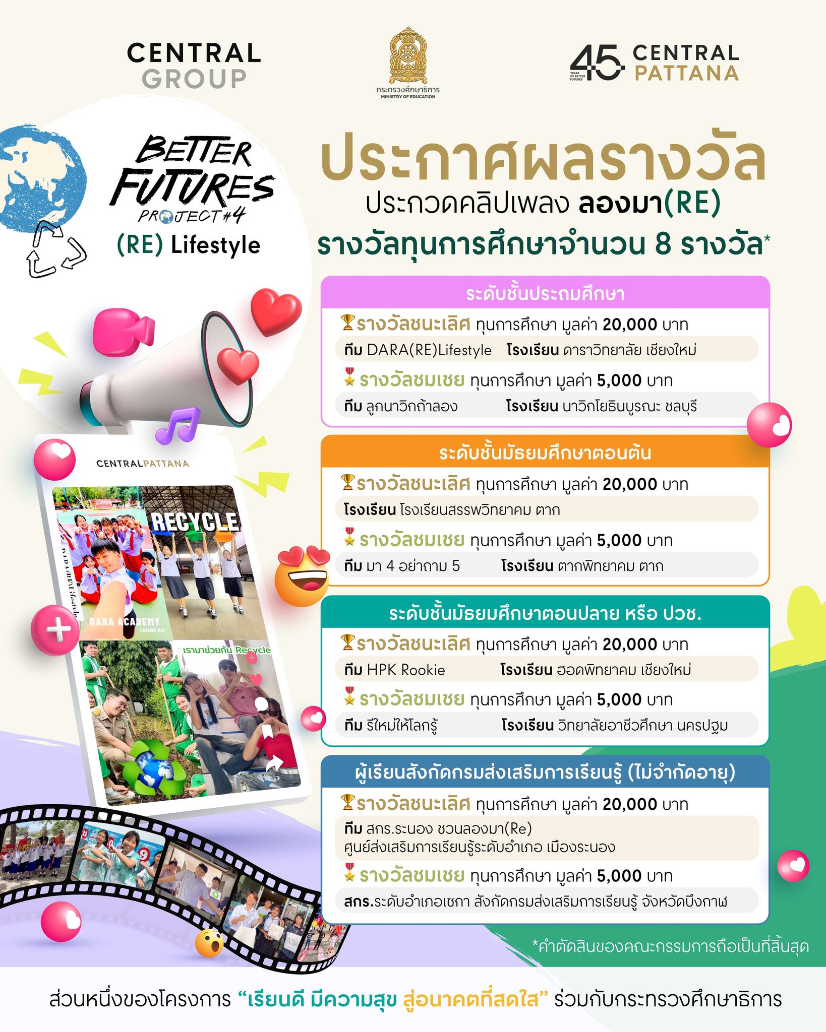 อีกทั้งเปิดโอกาสให้นักเรียนได้เรียนรู้ ผ่านการลงมือทำจริง ตามแนวทางการขับเคลื่อนเพื่อความยั่งยืน-เซ็นทรัล ทำ ของกลุ่มเซ็นทรัล จัดพิธีมอบประกาศนียบัตรและทุนการศึกษาใน “คลิปสั้นประกอบเพลง ‘ลองมา(RE)’ ภายใต้โครงการ “เรียนดี มีความสุข สู่อนาคตที่สดใส” ระหว่างกระทรวงศึกษาฯและเซ็นทรัลพัฒนา รวม 8 รางวัล และ 2 รางวัลพิเศษ จากผลงานของนักเรียนกว่า 120 ทีมทุกภูมิภาค ณ ศูนย์การค้าเซ็นทรัล ทั่วประเทศ