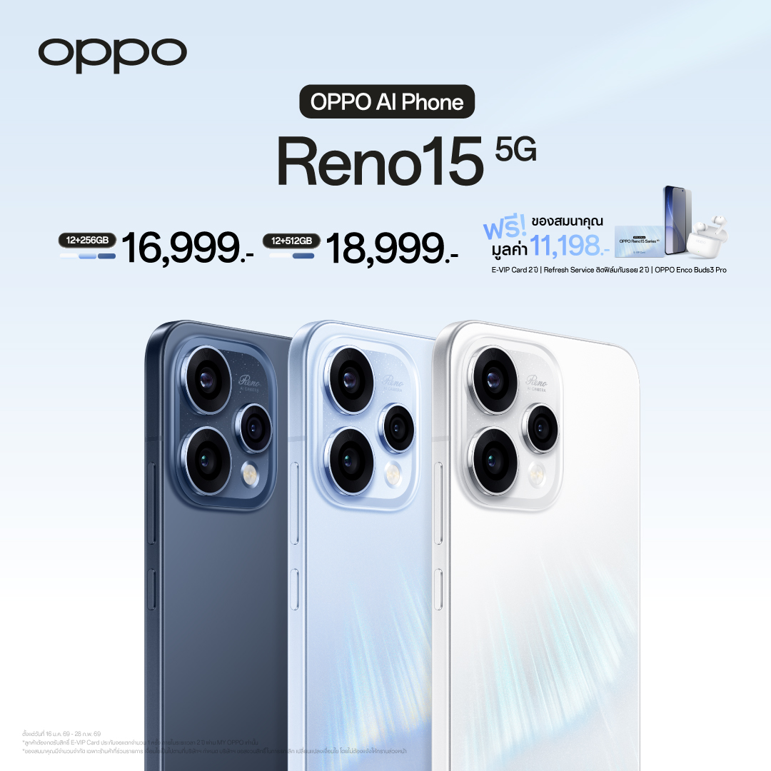 กรุงเทพฯ, 16 มกราคม 2569 : OPPO ประกาศวางจำหน่าย “OPPO Reno15 Series 5G” สมาร์ตโฟนเพื่อนซี้ เทรนดี้ทุกช็อต รุ่นใหม่ล่าสุด วางจำหน่ายในราคาสุดคุ้ม เริ่มต้นเพียง 11,999 บาท มาพร้อมโปรโมชั่นสุดพิเศษในช่วงวันนี้ – 28 กุมภาพันธ์ 2569 อีกทั้งยังมอบทุกประสบการณ์การใช้งานด้วย 2 ผลิตภัณฑ์ IoT ใหม่ อย่าง OPPO Watch S วางจำหน่ายในราคาเริ่มต้น 5,999 บาท และ OPPO Pad 5 ในราคาเริ่มต้น 13,999 บาท