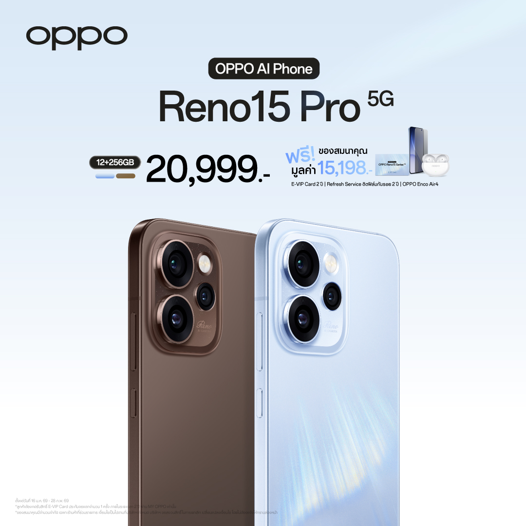 - สำหรับรุ่น OPPO Reno15 Pro Max 5G และ OPPO Reno15 Pro 5G จะได้รับ OPPO Enco Air4 มูลค่า 1,999 บาท