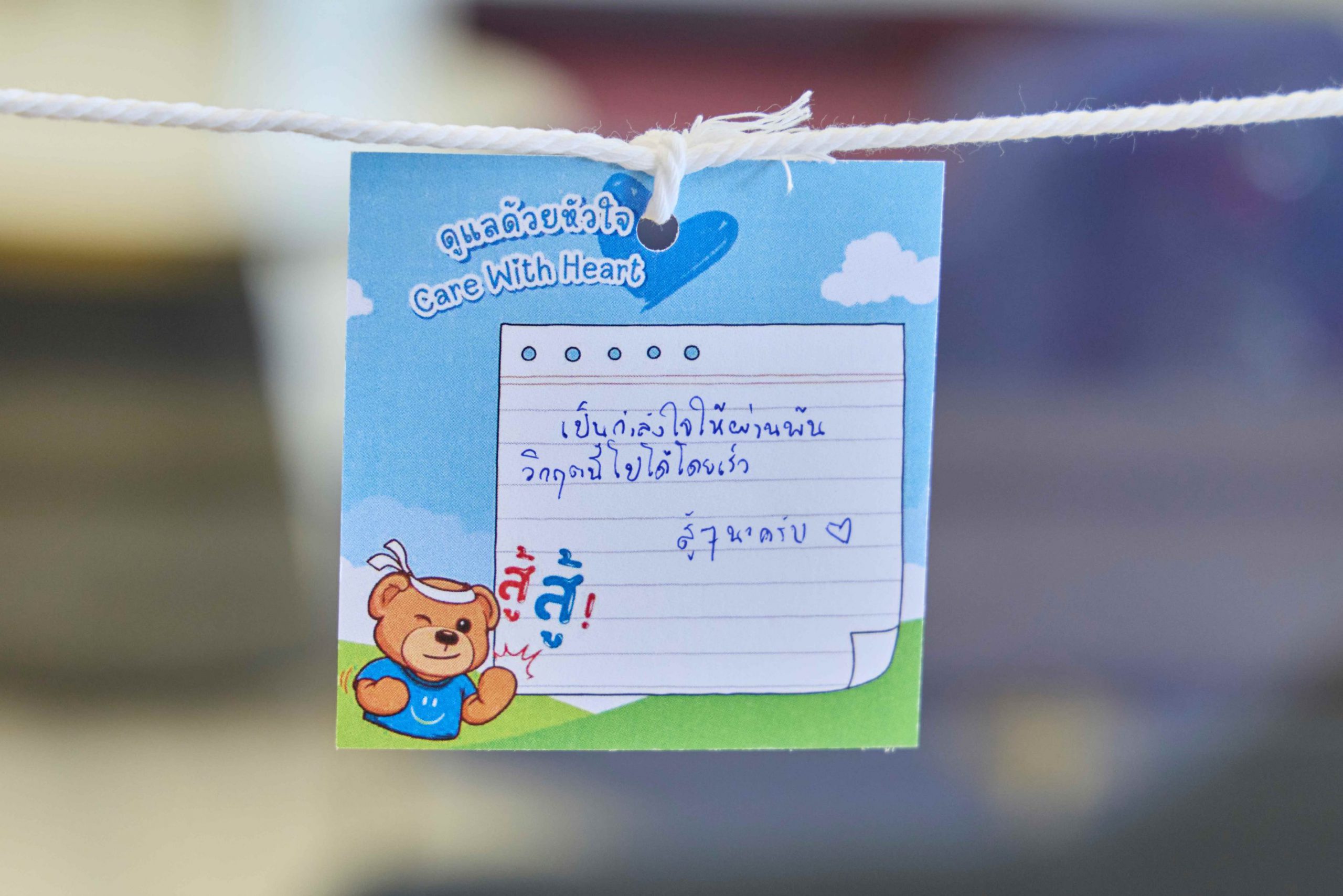 ไทยประกันชีวิตเชิญชวนพนักงานสำนักงานใหญ่ และสาขาทั่วประเทศ ร่วมส่งกำลังใจผ่านการมอบ “หมีไทยจิ” ซึ่งเป็นสัญลักษณ์ของการดูแลด้วยหัวใจ พร้อมเขียนการ์ดให้กำลังใจ “จากเพื่อนถึงเพื่อน” ให้แก่พนักงานและฝ่ายขายในพื้นที่ที่ได้รับผลกระทบ
