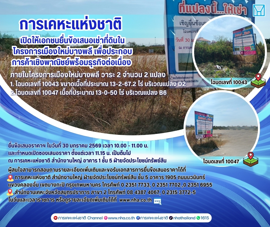 22 มกราคม 2569 : นายอรรคพล ภิรมย์ประดิษฐ์ ผู้อำนวยการฝ่ายจัดประโยชน์ทรัพย์สิน กล่าวว่า การเคหะแห่งชาติประกาศเปิดให้เอกชนยื่นข้อเสนอราคาการได้สิทธิเช่าที่ดิน เพื่อประกอบการค้าเชิงพาณิชย์ พร้อมธุรกิจต่อเนื่อง ภายในโครงการเมืองใหม่บางพลี วาระ 2 และวาระ 2 ส่วน 2 ตั้งอยู่ที่บริเวณถนนเลียบคลองส่งน้ำสุวรรณภูมิ ตำบลบางเสาธง อำเภอบางเสาธง จังหวัดสมุทรปราการ ดังนี้ 1.) โฉนดเลขที่ 10043 ขนาดเนื้อที่ประมาณ 13-2-67.2 ไร่ บริเวณแปลง D2 เพื่อให้เกิดความโปร่งใสในการดำเนินงานทุกขั้นตอนตามหลักธรรมาภิบาล