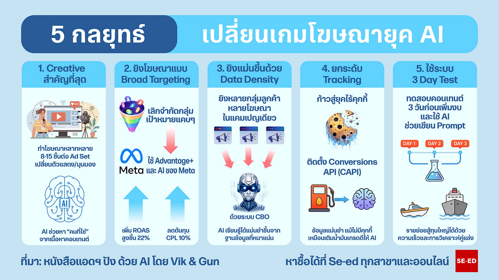 จากการรวบรวมประสบการณ์ตรงของคุณวิค - อัครวัฒน์ และคุณกัน - ชวพล ทั้งสองได้ถ่ายทอดลายแทงทางรอดผ่านหนังสือคู่มือการตลาด "แอดฯ ปังด้วย AI เปลี่ยนงบหลักร้อยเป็นเงินล้าน" โดยสรุป 5 กลยุทธ์ที่ต้องปรับใช้ทันที ดังนี้