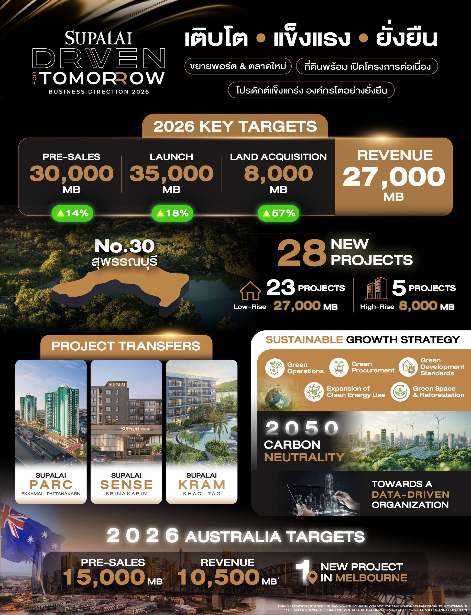 ศุภาลัยตั้งเป้ายอดขายรวมในปี 2569 ทั้งในประเทศไทยและประเทศออสเตรเลียที่ 45,000 ล้านบาท* แบ่งเป็นเป้ายอดขายในประเทศไทย 30,000 ล้านบาท และเป้ายอดขายจากประเทศออสเตรเลีย 15,000 ล้านบาท* ขณะเดียวกันบริษัทฯ ตั้งเป้ารายได้รวมทั้งสองประเทศที่ 37,500 ล้านบาท* โดยแบ่งเป็นตั้งเป้ารายได้ในประเทศไทย 27,000 ล้านบาท และเป้ารายได้จากประเทศออสเตรเลียประมาณ 10,500 ล้านบาท* โดยขับเคลื่อนการเติบโตอย่างสมดุล ผ่านการเพิ่มประสิทธิภาพโครงการพร้อมขาย เปิดตัวโครงการและขยายจังหวัดใหม่เพิ่มมากขึ้น รวมไปถึงการพัฒนาธุรกิจหลากมิติ ควบคู่ฐานะการเงินที่แข็งแกร่ง ด้วยสินทรัพย์รวมกว่า 98,000 ล้านบาท เครดิตเรตติ้งระดับ A ต่อเนื่อง 12 ปีซ้อน พร้อมต้นทุนทางการเงินต่ำ สะท้อนความพร้อมในการเติบโตอย่างมั่นคงและยั่งยืน