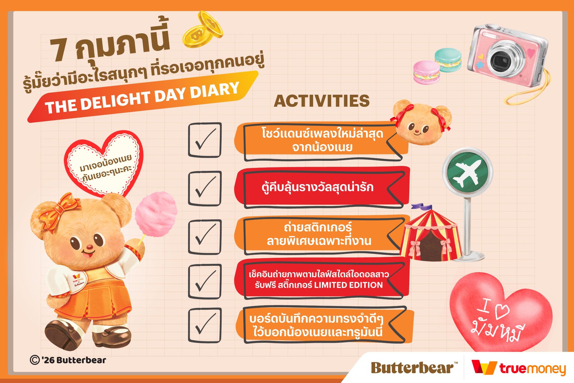 กรุงเทพฯ, 5 กุมภาพันธ์ 2569 : ทรูมันนี่ ผู้นำด้านบริการอิเล็กทรอนิกส์เพย์เมนต์และผู้ให้บริการทางการเงินดิจิทัลชั้นนำในภูมิภาคเอเชียตะวันออกเฉียงใต้ ชวนเหล่ามัมหมีร่วมสัมผัสประสบการณ์สุดเอกซ์คลูซิฟในงาน “The Delight Day Diary” อีเวนต์พิเศษที่มาพร้อมความน่ารักสดใสของ “น้องเนย” (Butterbear) ไอดอลสาวสุดฮอตขวัญใจมหาชน ยกทัพกิจกรรมมากมายมาไว้ในงานเดียว ให้แฟน ๆ ได้ร่วมสร้างโมเมนต์สุดประทับใจแบบใกล้ชิด โดยงานจะจัดขึ้นในวันเสาร์ที่ 7 กุมภาพันธ์ 2569 ณ INFINICITY HALL ชั้น 5 ศูนย์การค้าสยามพารากอน และเปิดให้เข้าร่วมงานฟรี ไม่มีค่าใช้จ่าย