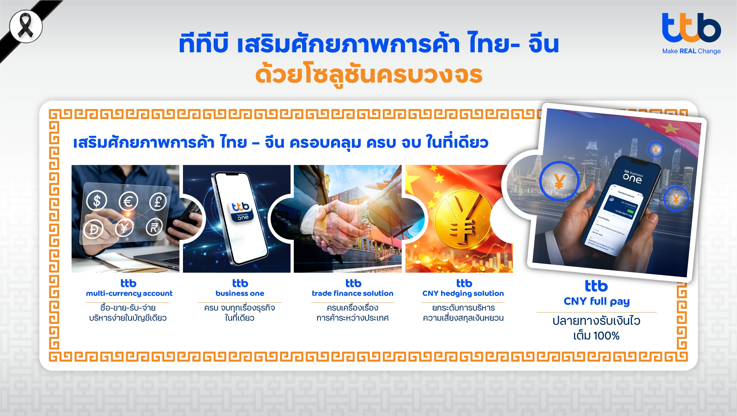 ทีทีบีมุ่งมั่นพัฒนาโซลูชันทางการเงินเพื่อรองรับการทำธุรกิจระหว่างประเทศที่มีความซับซ้อนและเปลี่ยนแปลงอย่างรวดเร็ว โดยมุ่งสนับสนุนผู้ประกอบการนำเข้า–ส่งออกอย่างครบวงจร ตั้งแต่การบริหารเงิน การทำธุรกรรม ไปจนถึงการบริหารความเสี่ยงจากอัตราแลกเปลี่ยน เพื่อให้การซื้อ–ขาย–รับ–จ่าย โดยเฉพาะกับคู่ค้าจีนเป็นไปอย่างมีประสิทธิภาพยิ่งขึ้น ปัจจุบัน ทีทีบีมีโซลูชันที่ตอบโจทย์การค้ากับคู่ค้าจีนในทุกมิติ อาทิ