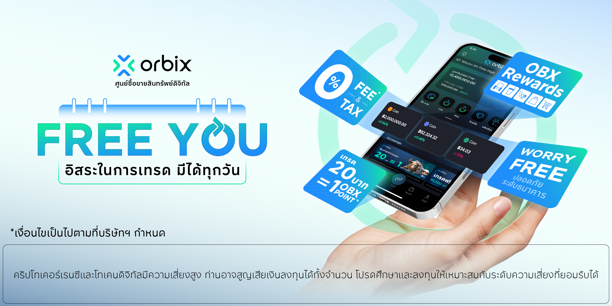 ผู้ใช้งานสามารถเทรดบนออร์บิกซ์โดยไม่มีค่าธรรมเนียม สำหรับยอดเทรดสูงสุด 60,000 บาทแรก* พร้อมรับสิทธิ์ Cashback ค่าธรรมเนียม 50 บาทต่อเดือน เมื่อมียอดเทรดสะสมครบ 20,000 บาทแรกในแต่ละเดือน เป็นระยะเวลา 3 เดือน เพียงกรอกโค้ด FREE26 ในช่องรหัสโปรโมชัน (Promo Code) เพื่อยืนยันสิทธิ์ ระยะเวลากิจกรรมตั้งแต่วันที่ 1 กุมภาพันธ์ – 30 เมษายน 2569 (จำกัดจำนวน 800 สิทธิ์ต่อเดือน นับรอบใหม่ทุกวันที่ 1 ของเดือน รวมทั้งหมด 2,400 สิทธิ์ ตลอดระยะเวลากิจกรรม)