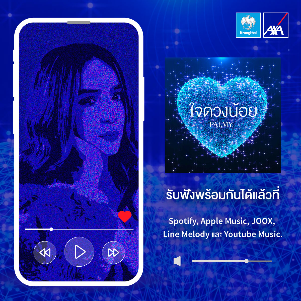 ทั้งนี้ ท่านสามารถรับฟังพร้อมดาวน์โหลด เพลง ใจดวงน้อย ผ่านช่องทาง Spotify, Apple Music, JOOX, Line Melody และ Youtube Music แพลตฟอร์มสตรีมมิ่งชั้นนำ และสามารถเข้าร่วมกิจกรรมสุดพิเศษของเพลง ใจดวงน้อย ลุ้นรางวัลแบบเอ็กซ์คลูซีฟ ผ่านช่องทางเฟสบุ๊ก Krungthai-axa Life หรือสอบถามข้อมูลเพิ่มเติม ได้ที่ โทร 1159 หรือ www.krungthai-axa.co.th