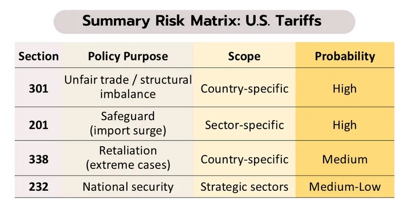 นอกจากนี้ มีความเป็นไปได้สูงที่สหรัฐจะหันไปใช้กฎหมายอื่นที่เพดานอัตราภาษีสูงกว่าและมีผลบังคับใช้นานกว่า เช่น มาตรา 301, 201, 232, และ 338 ซึ่งมีลักษณะเฉพาะเจาะจงรายประเทศหรือรายอุตสาหกรรม สถานการณ์ดังกล่าวสะท้อนถึงความเสี่ยงที่อาจเพิ่มขึ้นต่อภาคการค้า การลงทุน และบทบาทของประเทศต่างๆ ในห่วงโซ่อุปทานโลก