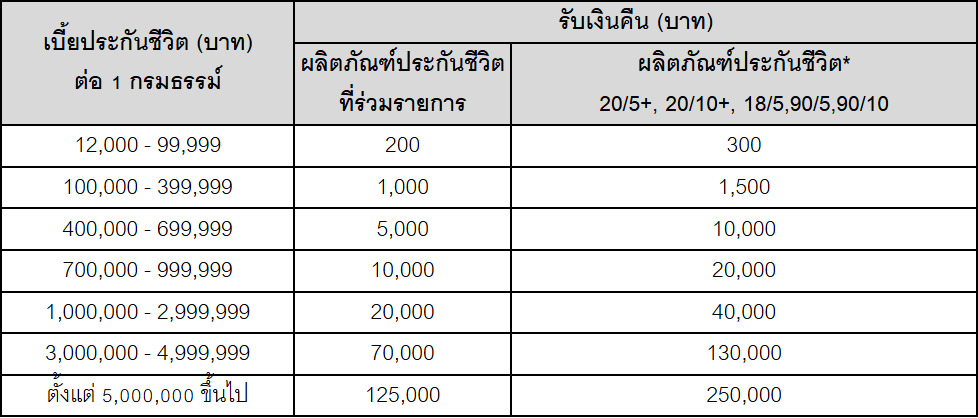 กรุงเทพฯ, 25 กุมภาพันธ์ 2569 : กรุงศรี (ธนาคารกรุงศรีอยุธยา จำกัด (มหาชน)) มอบสิทธิพิเศษสำหรับลูกค้าที่สมัครและชำระค่าเบี้ยประกันชีวิตที่ร่วมรายการแบบรายปี ปีแรก ตามแผนประกันที่เข้าร่วมรายการของ บริษัท อลิอันซ์ อยุธยา ประกันชีวิต จำกัด (มหาชน) หรือบริษัท ไทยประกันชีวิต จำกัด (มหาชน) ผ่านสาขาธนาคารกรุงศรี ตั้งแต่วันที่ 1 มกราคม – 30 มิถุนายน 2569 และคำขอเอาประกันชีวิตได้รับการอนุมัติภายในวันที่ 31 กรกฎาคม 2569 รับเงินคืนเข้าบัญชีออมทรัพย์ตามรายละเอียดดังนี้