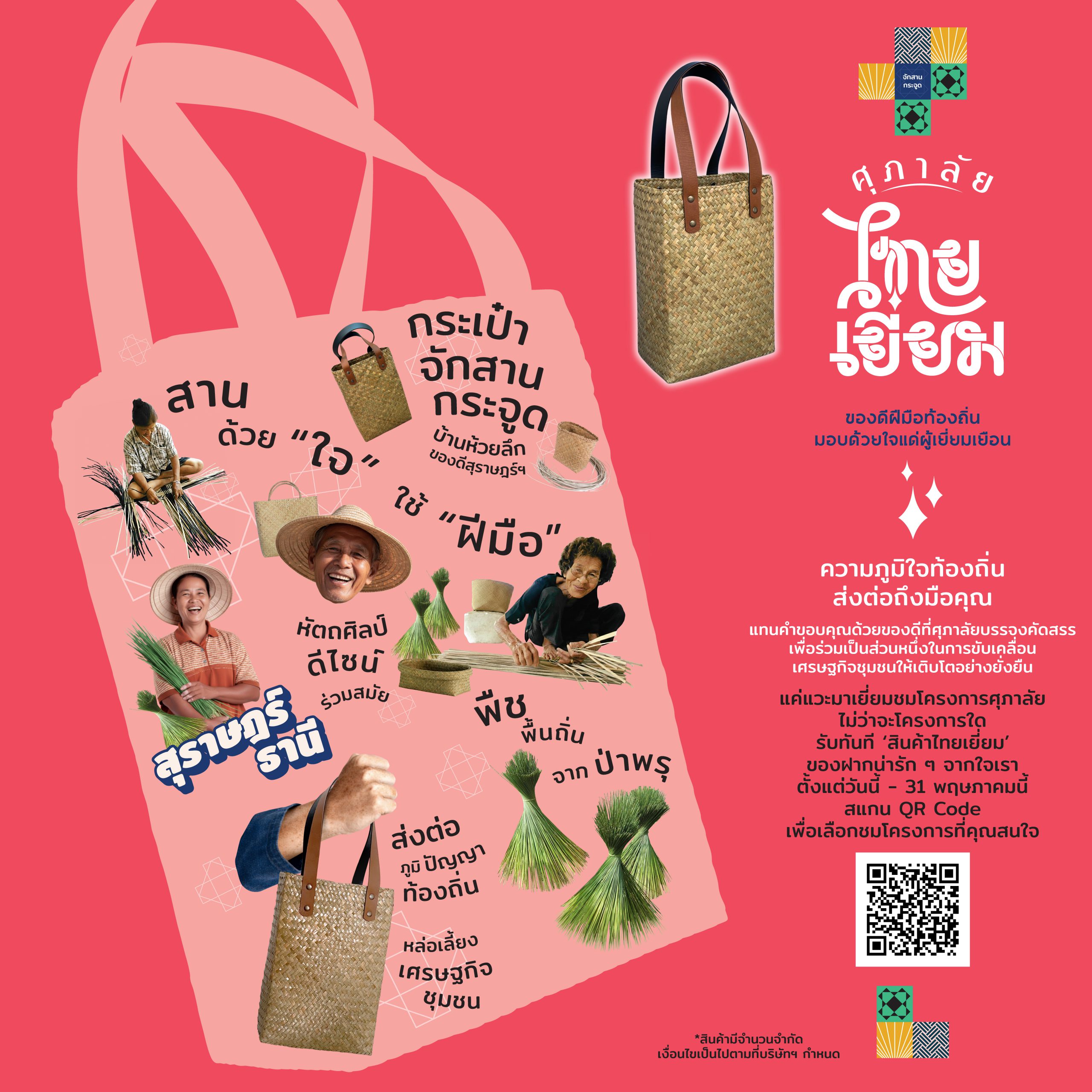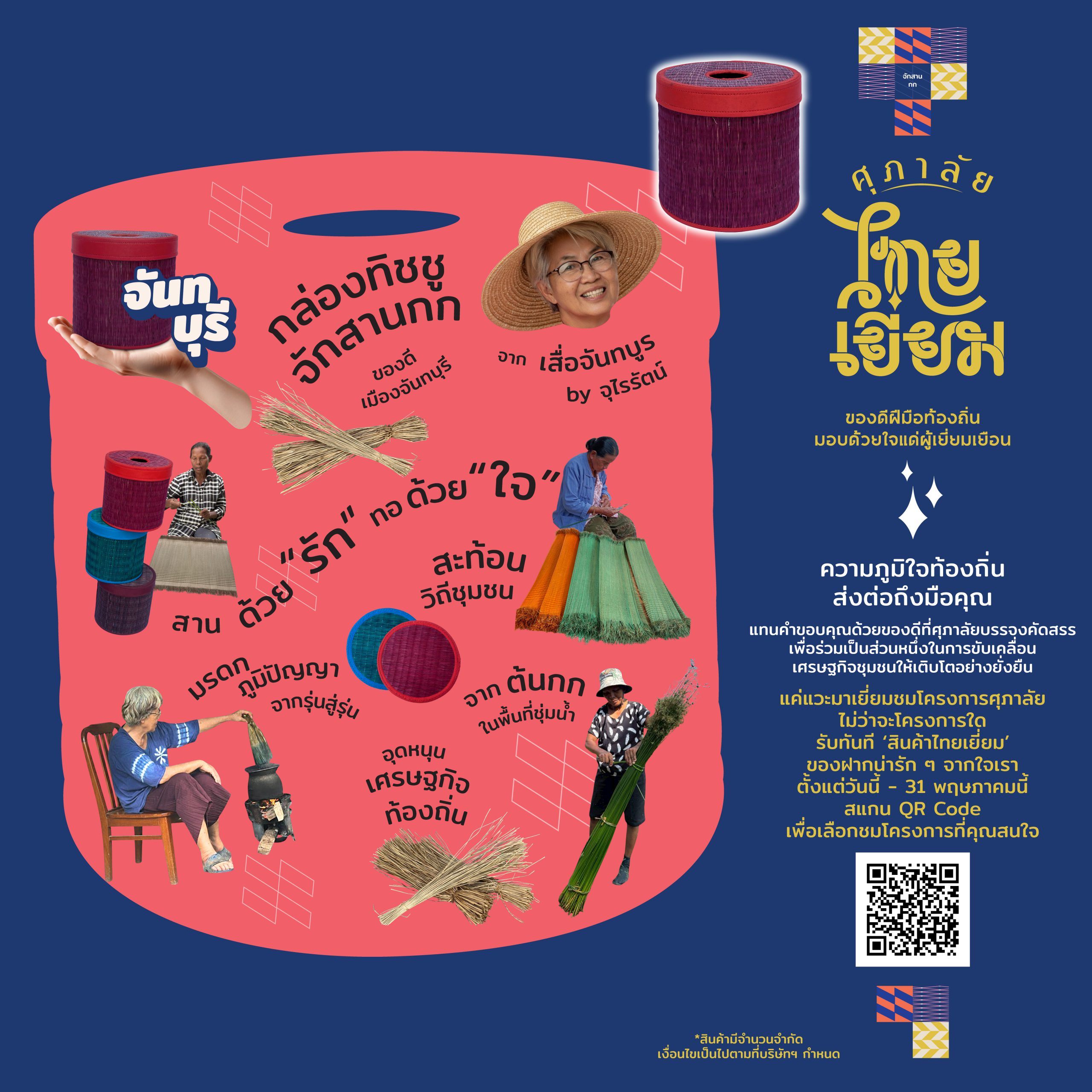 “ศุภาลัย ไทยเยี่ยม” รวบรวมผลิตภัณฑ์ที่สะท้อนอัตลักษณ์และภูมิปัญญาจากแต่ละพื้นที่ ไม่ว่าจะเป็นกระเป๋าจักสานกระจูดจากบ้านห้วยลึก จังหวัดสุราษฎร์ธานี ที่สานด้วยมือทีละเส้นจากวัสดุธรรมชาติ ชาสมุนไพร หอมป่า ฮ่อมดอย จากชุมชนแม่ทา จังหวัดเชียงใหม่ ที่ต่อยอดองค์ความรู้พื้นบ้านสู่ผลิตภัณฑ์ดูแลสุขภาพร่วมสมัย ดอกเกลือบ้านย่า จังหวัดสมุทรสาคร ที่สืบทอดวิถีนาเกลือดั้งเดิม กล่องทิชชูจักสานกกจากเสื่อจันทบูร จังหวัดจันทบุรี ที่ผสานงานหัตถกรรมกับดีไซน์เรียบง่ายใช้งานได้จริง และข้าวระยะเม่า จากตำบลสีสุก จังหวัดนครราชสีมา ซึ่งต้องเก็บเกี่ยวในช่วงเวลาที่พอดี อุดมด้วยสารอาหารที่มีประโยชน์