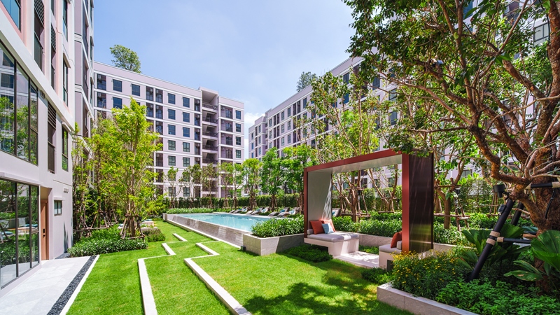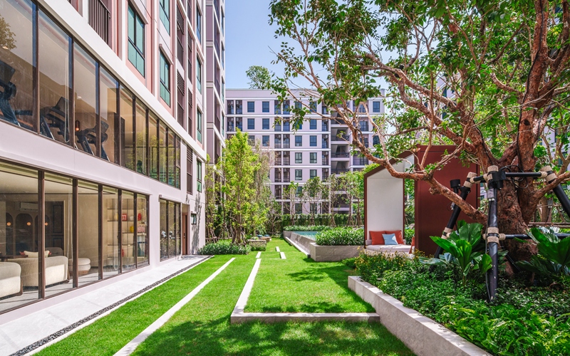- Vacation Vibes: พักผ่อนอย่างเต็มสูบกับไฮไลต์ VACATION POOL สระว่ายน้ำระบบเกลือความยาวกว่า 20 เมตร โอบล้อมด้วยพื้นที่สีเขียว THE GREEN STEP