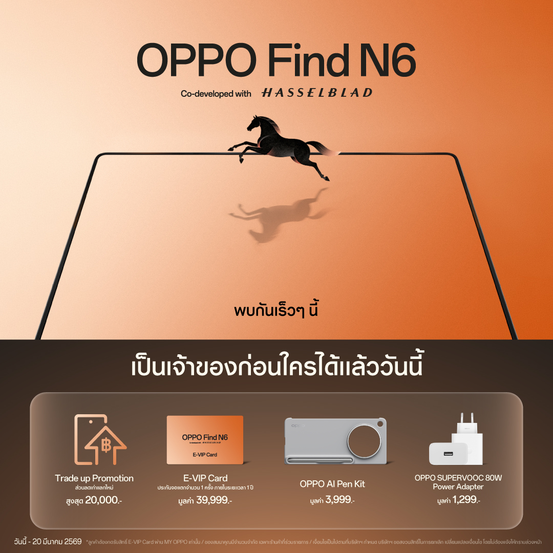 - แล้วเตรียมพบกับประสบการณ์สมาร์ตโฟนจอพับที่ เรียบกว่า อิสระกว่า และทรงพลังทุกมิติ กับ OPPO Find N6 พร้อมพลิกวงการสมาร์ตโฟนจอพับ พร้อมกันเร็ว ๆ นี้