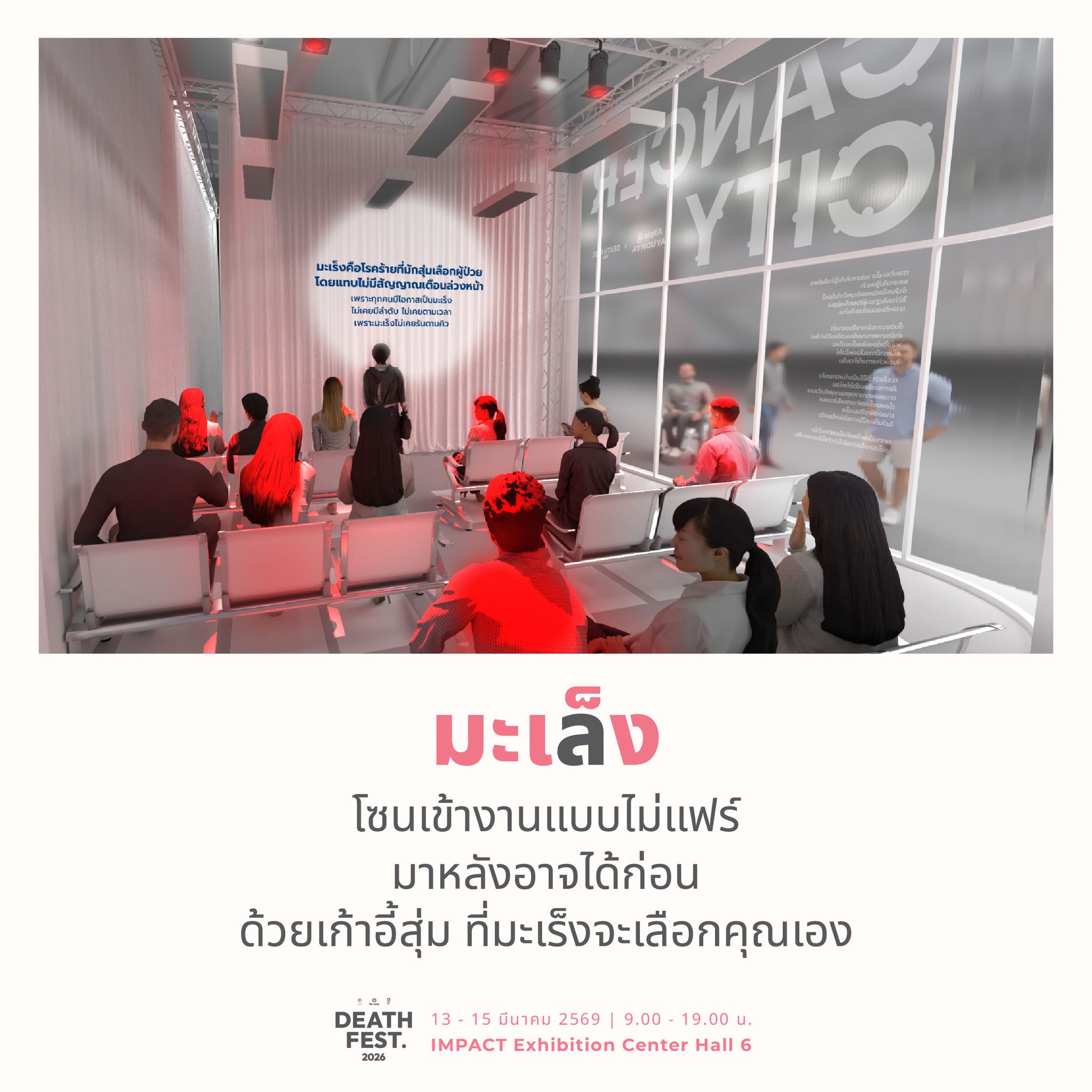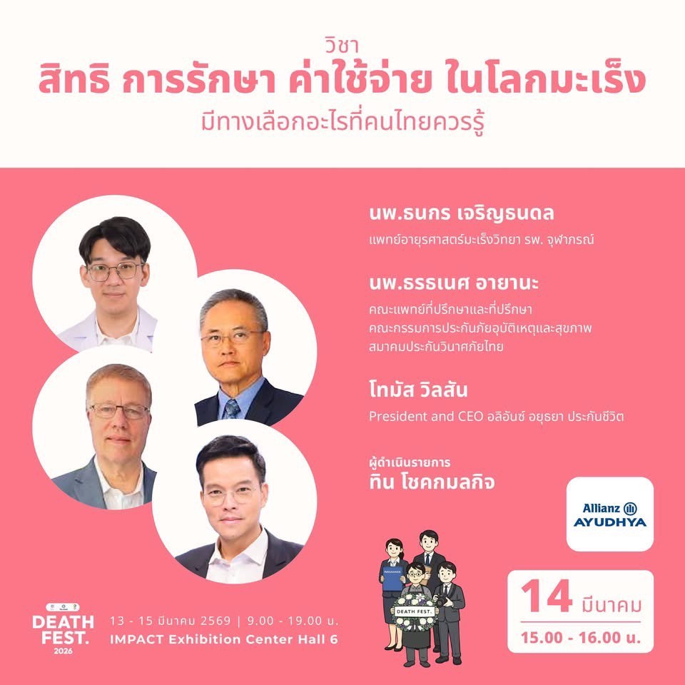 12 มีนาคม 2569 : บริษัท อลิอันซ์ อยุธยา ประกันชีวิต จำกัด (มหาชน) เปิดพื้นที่เรียนรู้รูปแบบใหม่ ชวนคนไทยทำความเข้าใจและเตรียมความพร้อมรับมือกับโรคมะเร็ง ผ่านโซนกิจกรรมพิเศษ “Cancer City: Live Experience เตรียมตัวเป็นมะเร็ง” ภายในงาน Death Fest 2026 ซึ่งจะจัดขึ้นระหว่างวันที่ 13 – 15 มีนาคม 2569 เวลา 09.00 – 19.00 น. ณ IMPACT Exhibition Center Hall 6 เพื่อเปิดมุมมองเกี่ยวกับโรคมะเร็ง และส่งเสริมให้สังคมตระหนักถึงความสำคัญของการเตรียมความพร้อมด้านสุขภาพและการวางแผนชีวิต