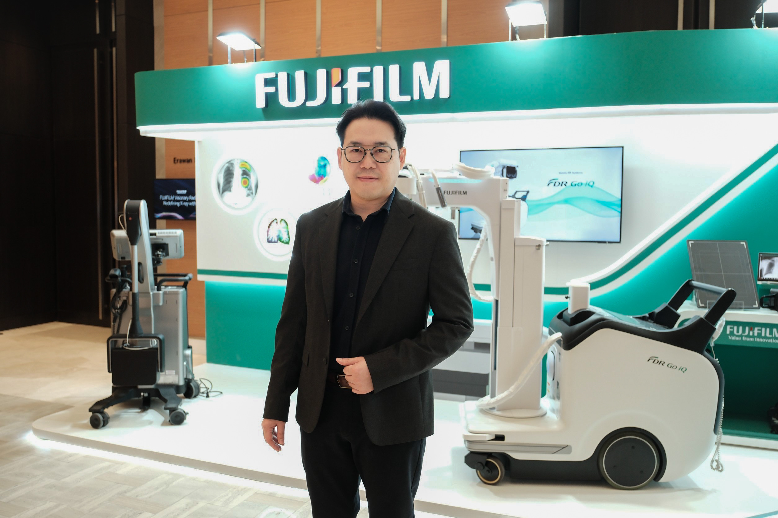 ในโอกาสนี้ ฟูจิฟิล์มยังได้เปิดตัวผลิตภัณฑ์เรือธงสองรุ่นใหม่ในตลาดประเทศไทยเป็นครั้งแรก ได้แก่ FDR Visionary Suite และ FDR Go iQ โดย นายรัชกฤช เต็มบุญศักดิ์ หัวหน้าหน่วยธุรกิจทางการแพทย์และสุขภาพ ดูแลในส่วนเครื่องเอกซเรย์และไอที บริษัท ฟูจิฟิล์ม (ประเทศไทย) จำกัด เผยว่า “FDR Visionary Suite" คือระบบเอกซเรย์ดิจิทัลระดับไฮเอนด์ที่ให้ภาพคมชัดด้วยเทคโนโลยีเฉพาะ Irradiated Side Sampling (ISS) ของฟูจิฟิล์ม โดยรุ่นอัปเกรดใหม่มาพร้อมฟีเจอร์กล้อง Live view ที่ช่วยยกระดับการดูแลผู้ป่วยและลดความเสี่ยงในการตรวจ ระบบ Motion Detection และ Last Image View จากฟีดถ่ายทอดสดช่วยลดการถ่ายภาพซ้ำ ขณะที่ระบบจัดท่าอัตโนมัติที่ขับเคลื่อนด้วย AI สำหรับการถ่ายภาพทรวงอก ช่วยเพิ่มความแม่นยำและประสิทธิภาพสำหรับแผนกรังสีวิทยาที่มีผู้ป่วยเป็นจำนวนมาก เทคโนโลยีนี้เข้ามาช่วยลดการถ่ายภาพซ้ำ ย่นระยะเวลาการตรวจ และสร้างประสบการณ์ที่ดีขึ้นสำหรับผู้ป่วยที่อาจกำลังเจ็บปวดหรือรู้สึกกังวล