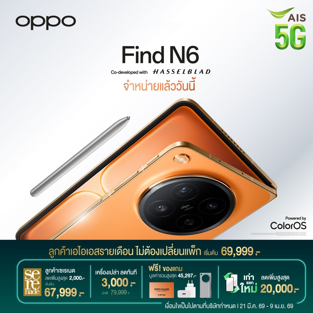 สามารถดูรายละเอียดและสั่งซื้อได้ที่ https://m.ais.co.th/oppo_findn6