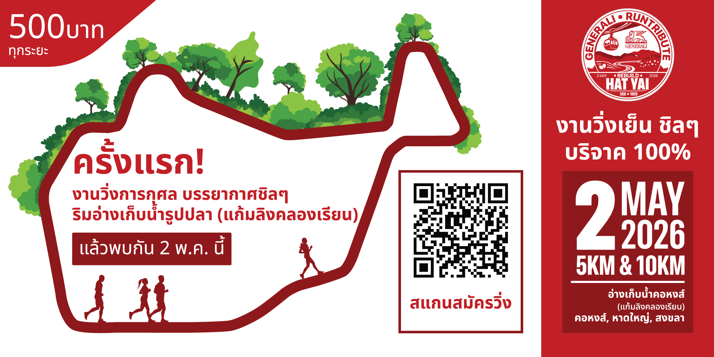 สำหรับกิจกรรม “GENERALI RUNTRIBUTE: REBUILD HAT YAI” จัดขึ้นในวันที่ 2 พฤษภาคม 2569 ตั้งแต่เวลา 14.00 - 20.00 น. ณ อ่างเก็บน้ำคอหงส์ (แก้มลิงคลองเรียน) เทศบาลเมืองคอหงส์ อำเภอหาดใหญ่ จังหวัดสงขลา โดยแบ่งรูปแบบการวิ่งออกเป็น Mini Marathon ระยะทาง 10 กิโลเมตร และ Fun Run ระยะทาง 5 กิโลเมตร ค่าสมัครเพียง 500 บาท ทุกระยะทาง พร้อมร่วมวิ่งไปกับ “วีเจจ๋า” ณัฐฐาวีรนุช ทองมี ที่จะมาร่วมสร้างสีสันและแรงบันดาลใจตลอดเส้นทาง