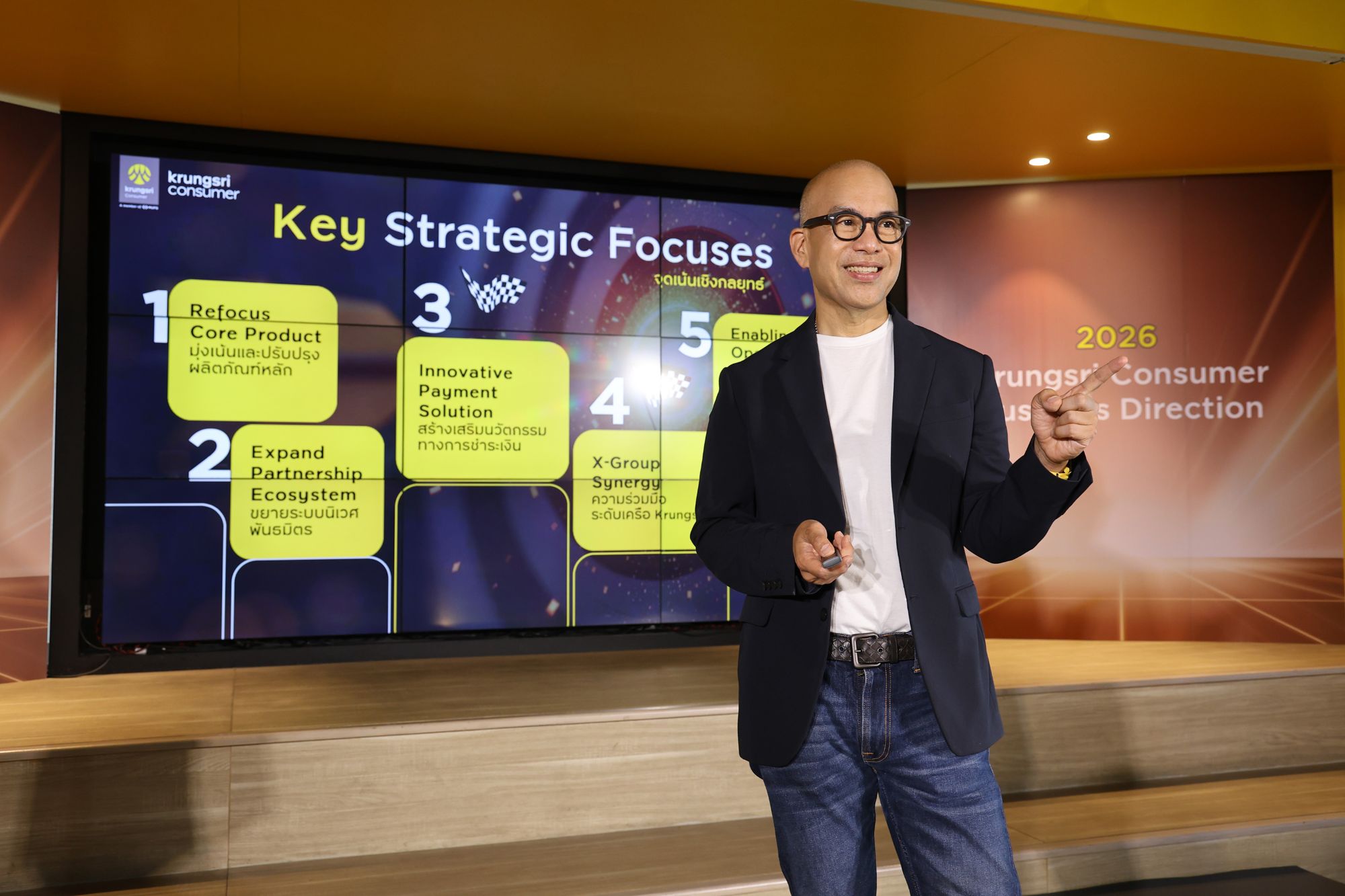 4. ผสานความร่วมมือในเครือกรุงศรีเพื่อสร้างโอกาสทางธุรกิจ โดยผสานความร่วมมือภายในกลุ่มกรุงศรี เช่น โครงการ One Krungsri P-Loan : มุ่งสู่การเป็นศูนย์กลางธุรกิจสินเชื่อส่วนบุคคลของเครือกรุงศรี เพื่อขยายฐานลูกค้าและเพิ่มประสิทธิภาพการดำเนินงาน, One Krungsri Insurance : ขับเคลื่อนธุรกิจนายหน้าประกันภัยพร้อมสนับสนุนโมเดลธุรกิจเพื่อการเติบโตของกลุ่มกรุงศรี, One Krungsri Wealth : พัฒนาสิทธิประโยชน์บัตรเครดิตให้ตอบโจทย์กลุ่ม Wealth ของธนาคาร