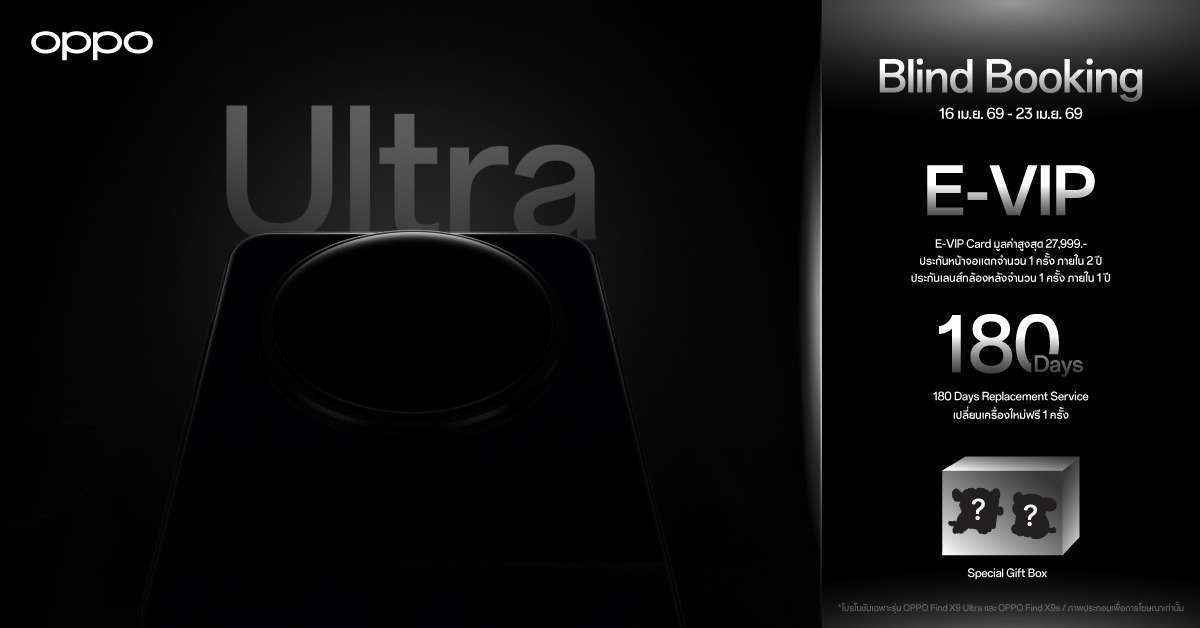 กรุงเทพฯ, 20 เมษายน 2569 : ออปโป้ ประเทศไทย ผู้นำตลาดสมาร์ตโฟน เตรียมเปิดตัวสมาร์ตโฟนรุ่นใหม่ล่าสุด ชวนสัมผัสประสบการณ์การถ่ายภาพระดับมืออาชีพนี้ได้ในงาน “Ultra Imaging Night OPPO Find X9 Ultra | OPPO Find X9s” โดยภายในงานยังยกทัพนวัตกรรมรุ่นใหม่ล่าสุด นำโดย OPPO Find X9 Ultra และ OPPO Find X9s พร้อมด้วย OPPO Enco Clip2, OPPO Enco Air5 Pro และ OPPO Watch X3 อุปกรณ์อัจฉริยะที่เติมเต็มประสบการณ์ทั้งด้านความบันเทิง และสุขภาพอย่างครบถ้วน