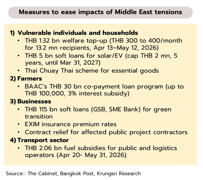 ไทย: รัฐบาลออกมาตรการบรรเทาผลกระทบจากวิกฤตตะวันออกกลาง คาดผลบวกยังค่อนข้างจำกัด โดยเมื่อวันที่ 11 เมษายน คณะรัฐมนตรีมีมติเห็นชอบมาตรการบรรเทาผลกระทบและป้องกันความเสี่ยงทางเศรษฐกิจจากสถานการณ์ความตึงเครียดในตะวันออกกลาง ซึ่งประกอบด้วย มาตรการบรรเทาภาระค่าครองชีพของประชาชนกลุ่มเปราะบาง การช่วยเหลือกลุ่มเกษตรกร ภาคธุรกิจ และภาคการขนส่ง ตลอดจนมาตรการส่งเสริมการลงทุนในพลังงานสะอาด