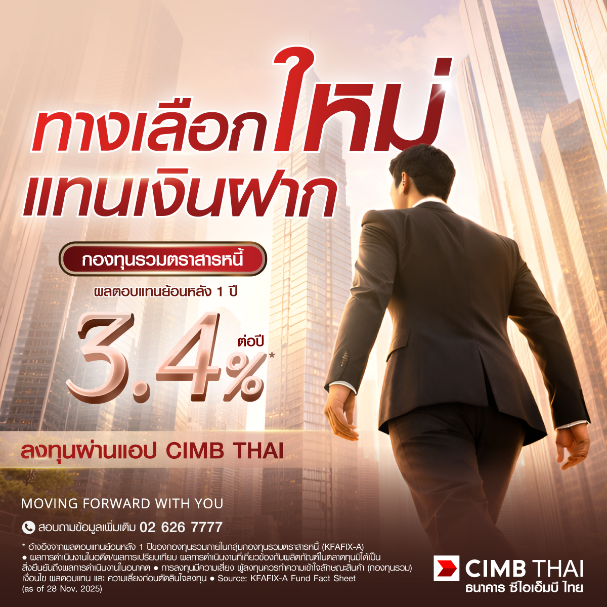 ประกอบกับสถานการณ์ความไม่แน่นอนระหว่างสหรัฐ-อิหร่าน ส่งผลกระทบตลาดการเงินผันผวน ทำให้นักลงทุนลดสินทรัพย์เสี่ยงลง และขยับไปหาที่พักเงินระยะสั้น แต่ให้ความมั่นคงมากขึ้น ในเวลาเดียวกัน ความตึงเครียดทางภูมิรัฐศาสตร์ ก็ส่งผลให้แรงกดดันเงินเฟ้อเร่งตัว กลุ่มผู้ออมเงินที่ทิ้งเงินไว้ในเงินฝาก ดอกเบี้ยที่ได้รับอาจไม่ทันเงินเฟ้อ ประกอบกับแนวโน้มดอกเบี้ยช่วงขาลง หลังจากธนาคารแห่งประเทศไทยปรับลดอัตราดอกเบี้ยนโยบายลงมาอยู่ที่ 1.00% (ณ 25 ก.พ. 2569) และ CIMB THAI คาดว่าจะคงระดับดังกล่าวตลอดปี ส่งผลให้เงินฝากมีแนวโน้มให้ผลตอบแทนต่ำต่อเนื่อง
