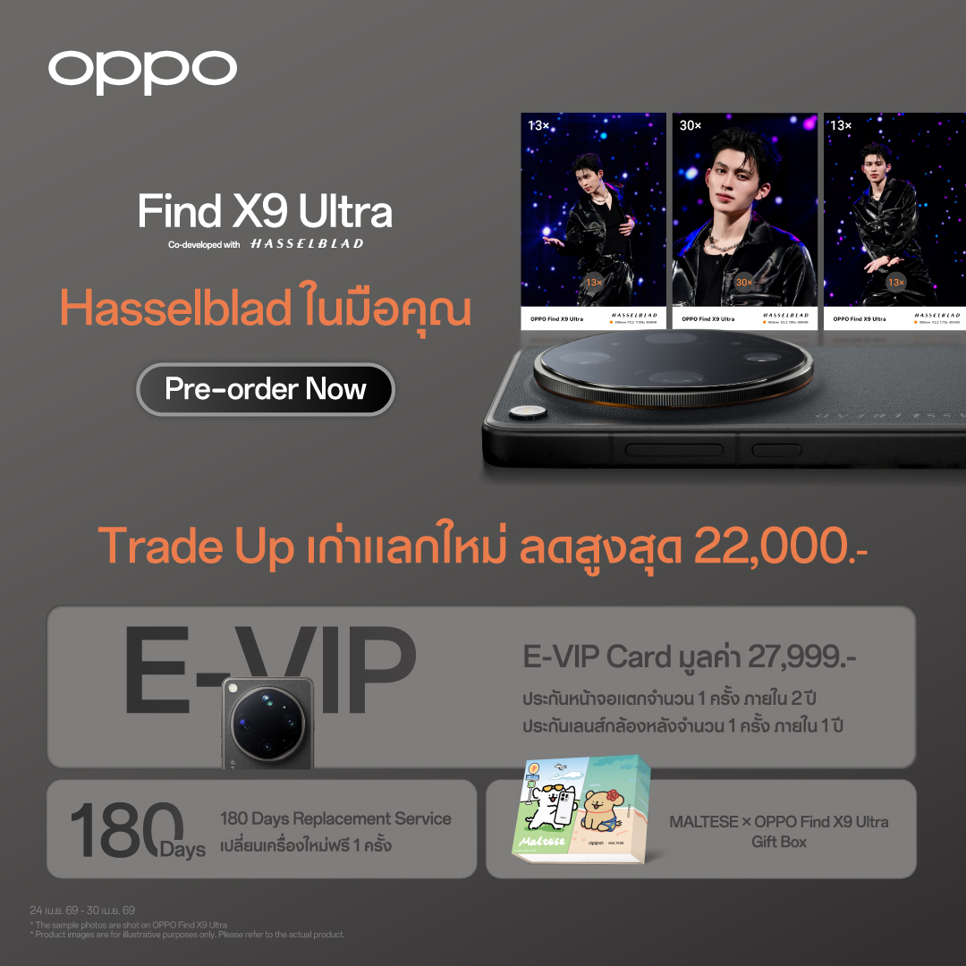 กรุงเทพฯ, 23 เมษายน 2569 : ออปโป้ ไทยแลนด์ ผู้นำตลาดสมาร์ตโฟนปี 2569 เปิดตัว “OPPO Find X9 Ultra” สมาร์ตโฟนแฟลกชิปรุ่นใหม่กับกล้องระดับอัลตราที่แท้จริง มุ่งขยายส่วนแบ่งการตลาดในกลุ่มผู้บริโภคระดับบนผ่านนวัตกรรมที่ตอบโจทย์สายครีเอเตอร์ ไม่ว่าจะเป็นสายคอนเสิร์ต และสายท่องเที่ยว ชูไฮไลต์ OPPO Find X9 Ultra ด้วยกล้อง Hasselblad 50MP เทเลโฟโต้ ซูมออปติคอล 10 เท่า