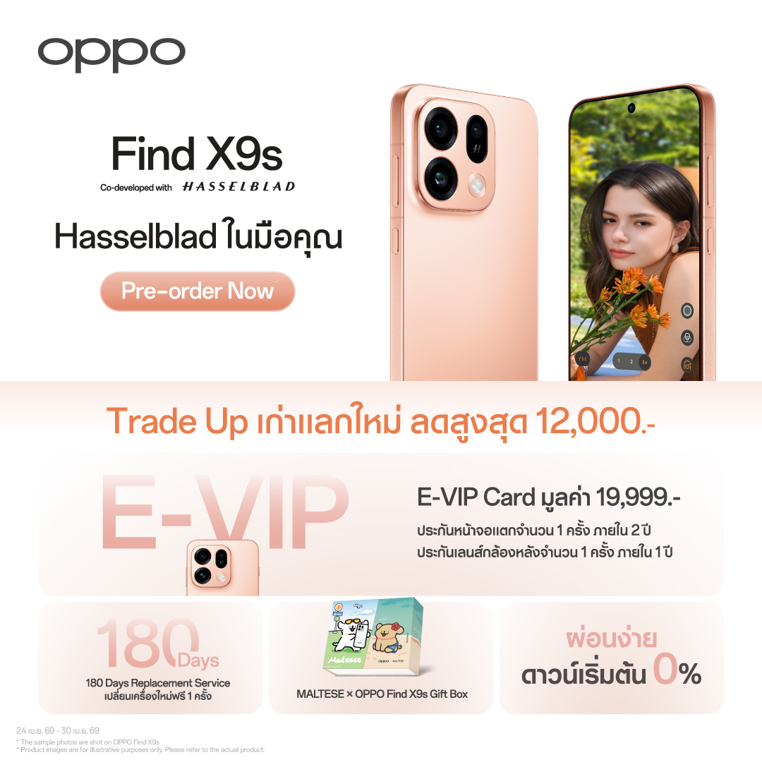 สำหรับผู้ที่สนใจเป็นเจ้าของ OPPO Find X9 Ultra และ OPPO Find X9s สามารถสั่งจองได้ตั้งแต่วันที่ 24 - 30 เมษายน 2569 พร้อมรับข้อเสนอสุดพิเศษในช่วง Pre-order และเป็นเจ้าของได้ง่ายมากยิ่งขึ้นด้วยโปรโมชั่น Trade-up นำเครื่องเก่ามาแลกเครื่องใหม่ ลดสูงสุด 22,000 บาท