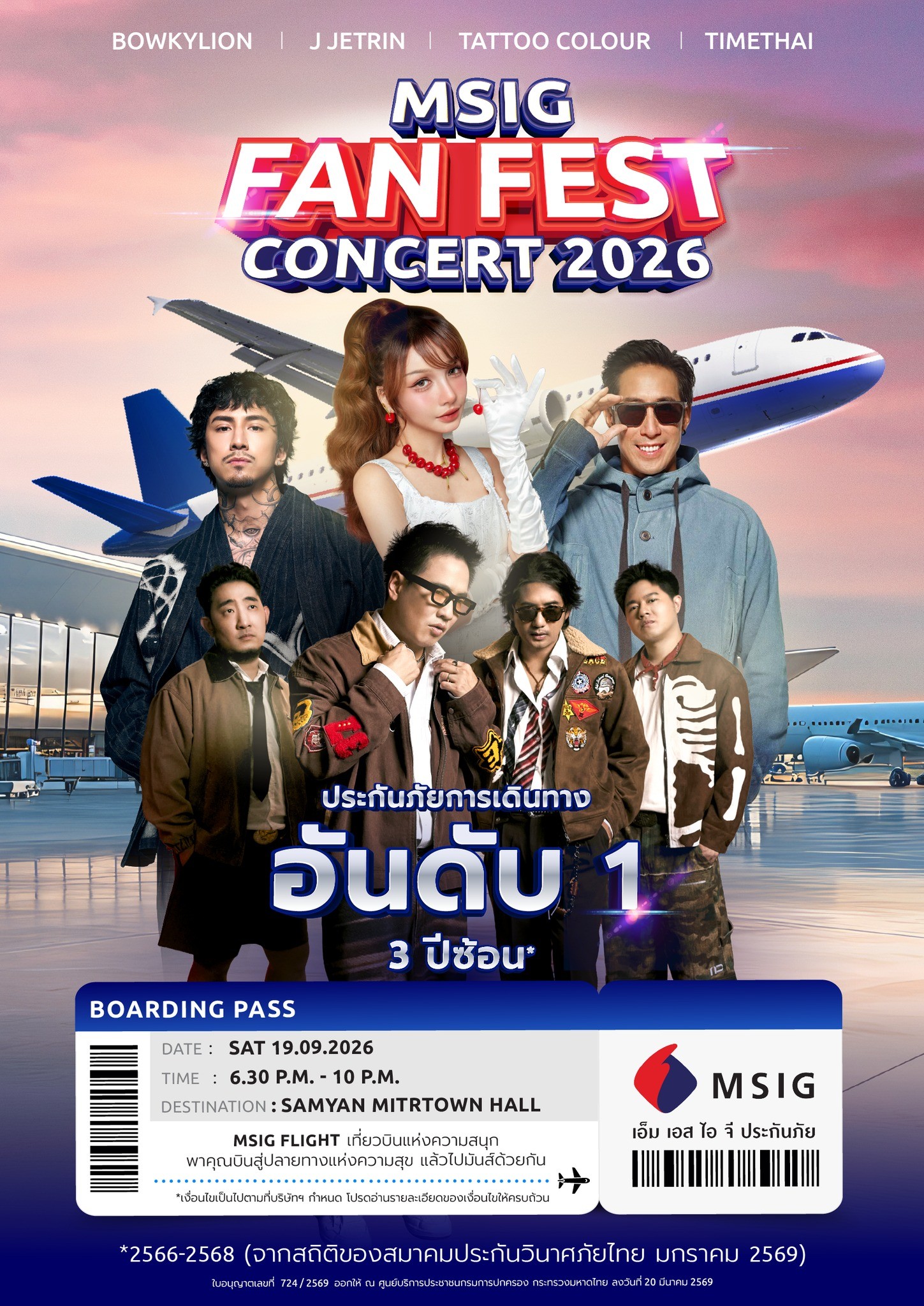นายรัฐพล กล่าวต่อไปว่า เพื่อขอบคุณและตอบแทนลูกค้าที่ให้ความไว้วางใจกว่า 10 ปีในผลิตภัณฑ์ประกันภัยเดินทางต่างประเทศของบริษัท MSIG เตรียมจัดคอนเสิร์ตใหญ่ “MSIG Fan Fest 2026” พร้อมมอบสิทธิพิเศษสำหรับผู้ที่ซื้อประกันภัยการเดินทาง MSIG Travel Easy Plus ระหว่างวันที่ 1 เมษายน – 30 มิถุนายน 2569 ดังนี้