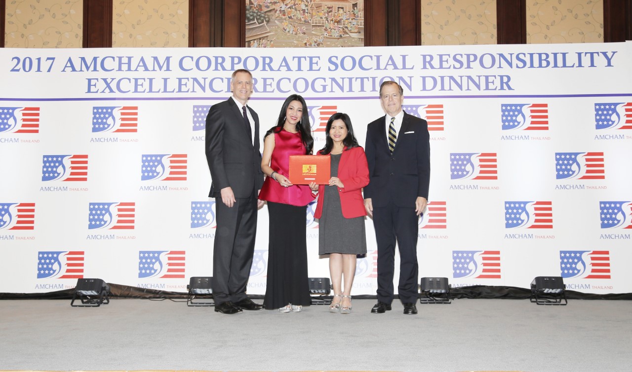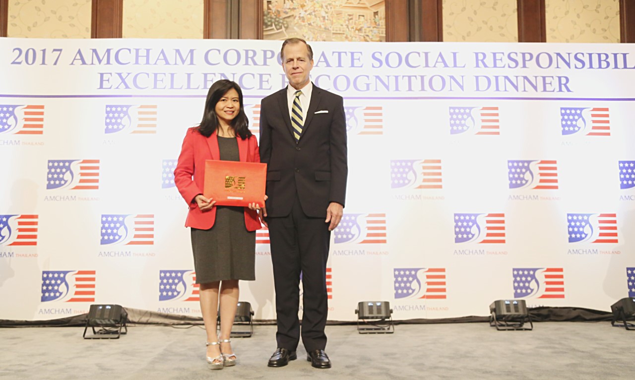 22 พฤศจิกายน 2560 : ณาตยา สุขุม (ที่ 2 จากขวา) ประธานเจ้าหน้าที่ฝ่ายการตลาด และ รพีพร วงศ์ทอง ผู้อำนวยการฝ่ายสื่อสารองค์กรและภาพลักษณ์ เอไอเอ ประเทศไทย ร่วมรับรางวัลบริษัทที่มีความรับผิดชอบต่อสังคมดีเด่น หรือ AMCHAM CSR Excellence Recognition 2017 ระดับ Gold จากสภาหอการค้าอเมริกันแห่งประเทศไทย โดยมี ฯพณฯ กลิน ที เดวีส์ (ขวาสุด) เอกอัครราชทูตสหรัฐอเมริกาประจำประเทศไทย เป็นประธานมอบรางวัล ซึ่งเอไอเอได้รับรางวัลดังกล่าวติดต่อกันเป็นปีที่ 6