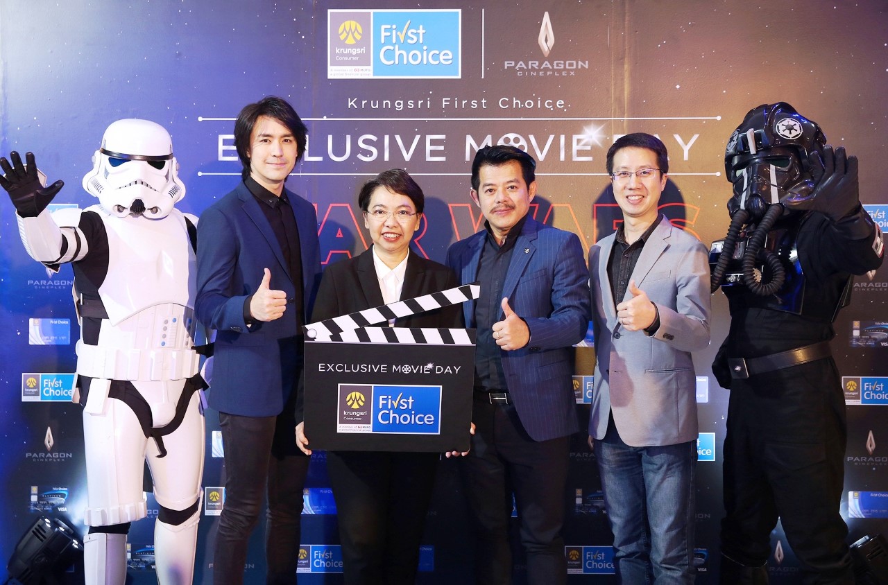 15 ธันวาคม 2560 : บัตรกรุงศรีเฟิร์สช้อยส์ นำโดย ณญาณี เผือกขำ กรรมการผู้จัดการ บริษัท อยุธยา แคปปิตอล เซอร์วิสเซส จำกัด จับมือ นิธิ พัฒนภักดี รองประธานเจ้าหน้าที่บริหาร ฝ่ายสื่อโฆษณา บริษัท เมเจอร์ ซีนีเพล็กซ์ กรุ้ป จำกัด (มหาชน) จัดงาน กรุงศรีเฟิร์สช้อยส์ สตาร์ วอร์ส: ปัจฉิมบทแห่งเจได “เอ็กซ์คลูซีฟ มูฟวี่ เดย์” ส่งความสุขให้สมาชิกบัตรกรุงศรีเฟิร์สช้อยส์ พริวิเลจ บลู และ บลู พลัส ชวนร่วมชมสุดยอดภาพยนตร์ฟอร์มยักษ์ “STAR WARS – The Last Jedi” ก่อนใคร พร้อมสนุกสนานกับมินิคอนเสิร์ต จาก รุจ-เดอะสตาร์ ณ โรงภาพยนตร์สยามภาวลัย สยามพารากอน