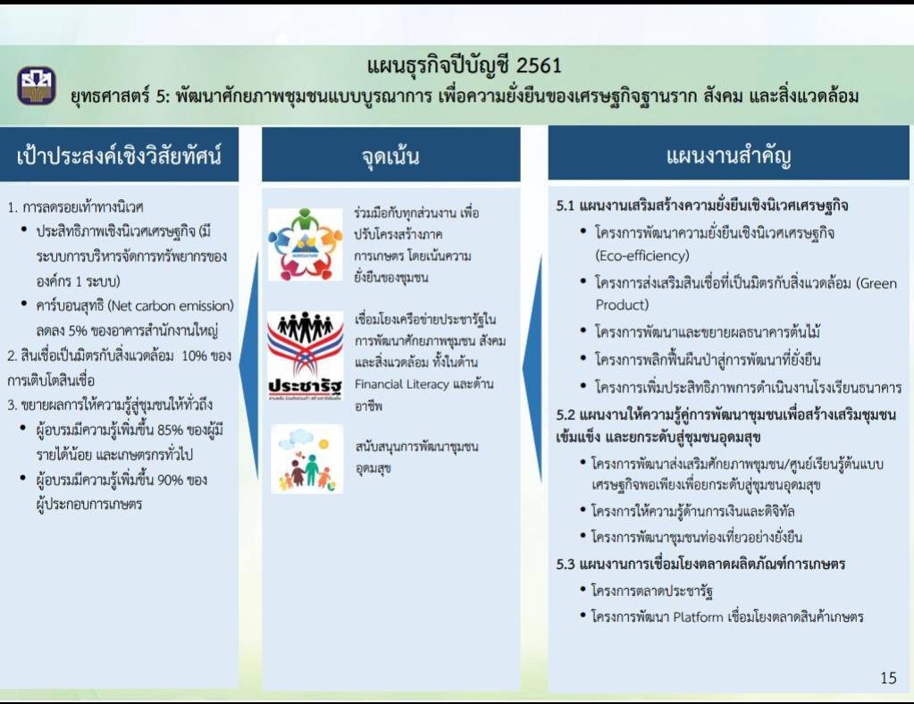 ยุทธศาสตร์ที่ 5 พัฒนาศักยภาพชุมชนแบบบูรณาการเพื่อความยั่งยืนของเศรษฐกิจฐานรากสังคมและสิ่งแวดล้อม ที่ให้ความสำคัญกับ แผนงานเสริมสร้างความยั่งยืนเชิงนิเวศเศรษฐกิจ แผนงานการเชื่อมโยงตลาดผลิตภัณฑ์การเกษตรและแผนงานให้ความรู้คู่การพัฒนาชุมชนเพื่อสร้างเสริมชุมชนเข้มแข็ง และยกระดับสู่ชุมชนอุดมสุข