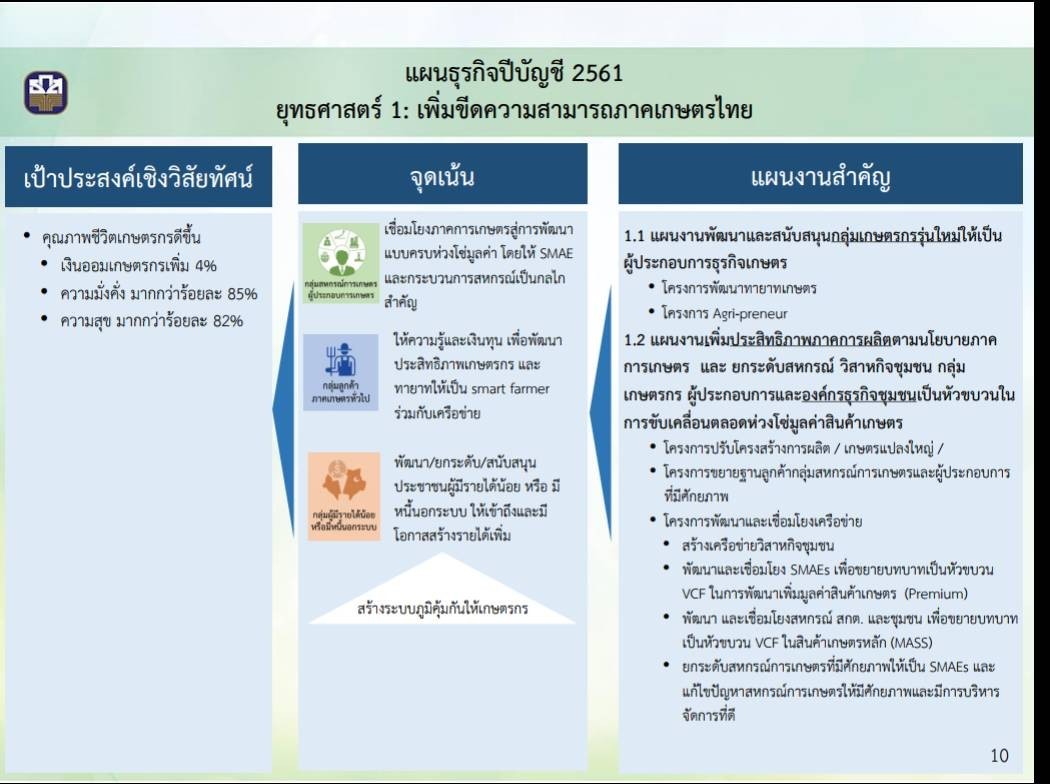 ยุทธศาสตร์ที่ 1 เพิ่มขีดความสามารถภาคเกษตรไทย แผนงานเพิ่มประสิทธิภาพภาคการผลิต ตามนโนบายภาคการเกษตร และยกระดับสหกรณ์ วิสาหกิจชุมชน กลุ่มเกษตร ผู้ประกอบการและองค์กรธุรกิจชุมชนเป็นหัวขบวนในการขับเคลื่อนตลอดห่วงโซ่มูลค่าสินค้าเกษตร แผนงานพัฒนาและสนับสนุนกลุ่มเกษตรกรรุ่นใหม่ให้เป็น ผู้ประกอบการธุรกิจเกษตร