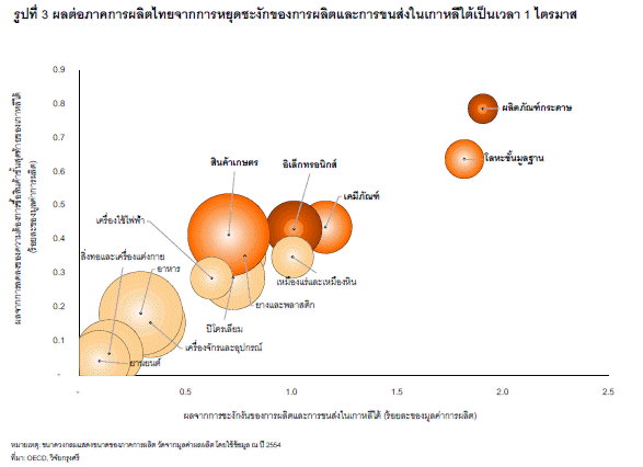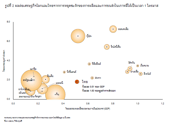 หากเกาหลีใต้ไม่สามารถผลิตหรือขนส่งสินค้าได้เป็นเวลา 1 ไตรมาส จะส่งผลให้มูลค่าการส่งออกทั้งปีของไทยลดลงร้อยละ 1.8 หรือทำให้ผลผลิตมวลรวม (GDP) หายไปร้อยละ 0.5 อย่างไรก็ดี ไทยจะได้รับผลกระทบน้อยกว่าประเทศผู้ส่งออกสำคัญรายอื่นในภูมิภาคเอเชีย อาทิ ไต้หวัน มาเลเซีย และเวียดนาม ซึ่งมีความเชื่อมโยงทางการค้ากับเกาหลีใต้สูงกว่าไทย (รูปที่ 2)