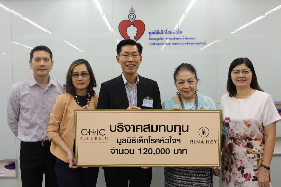 24 มกราคม 2561 : กิจจา ปัทมสัตยาสนธิ (ยืนกลาง) กรรมการผู้จัดการ บริษัท ชิค รีพับบลิค จำกัด (มหาชน) โฮมแฟชั่นสโตร์แห่งแรกและแห่งเดี ยวในประเทศไทยที่รวบรวมเฟอร์นิ เจอร์และของแต่งบ้าน ที่โดดเด่นและแตกต่างด้วยเอกลัก ษณ์เฉพาะตัวที่ไม่เหมือนใคร ภายใต้แนวคิด “Home Fashion Store” ร่วมด้วยทีมผู้บริหาร มอบเงินสมทบทุน ภายใต้แคมเปญ ‘CHIC Time for Gift Time to Give’ ซึ่งจัดขึ้นในเดือนธันวาคม 2560 ที่ผ่านมา สนับสนุนมูลนิธิเด็กโรคหัวใจในพ ระอุปถัมภ์ของสมเด็จพระเจ้าพี่น างเธอเจ้าฟ้ากัลยาณิวัฒนา กรมหลวงนราธิวาสราชนครินทร์ รับมอบโดย นางฉันทนา ดาวราย (ที่ 2 จากขวา) รองประธานมูลนิธิเด็กโรคหัวใจฯ ณ มูลนิธิเด็กโรคหัวใจฯ ชั้น 4 อาคารเฉลิมพระบารมี 50 ปี เมื่อเร็วๆ นี้ ![]()