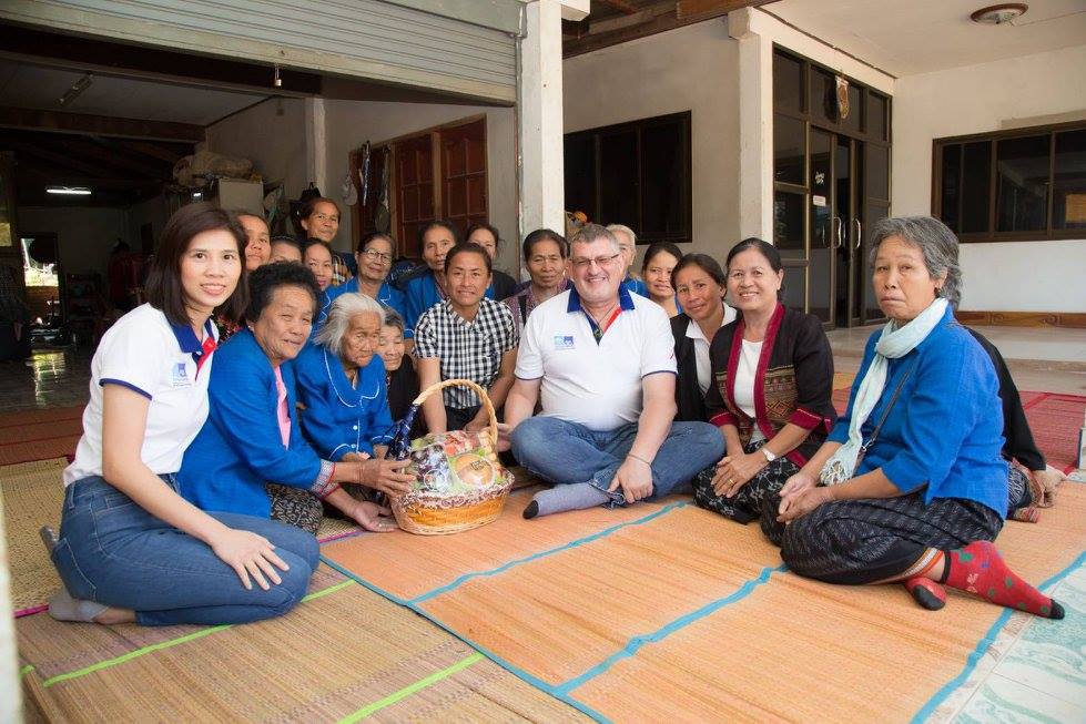 มร.เดวิด โครูนิช ประธานกรรมการบริหาร บมจ.กรุงไทย-แอกซ่า ประกันชีวิต เข้าเยี่ยม และมอบกระเช้าปีใหม่ให้แก่ป้าใบ กสินทรเกตุ ตัวแทนชุมชนทอผ้าบ้านหนองหญ้าไซ จ.อุดรธานี ซึ่งเป็นชุมชนที่ทอผ้าปกกรมธรรม์ให้กับลูกค้ากรุงไทย-แอกซ่า อย่างต่อเนื่องเป็นปีที่ 6