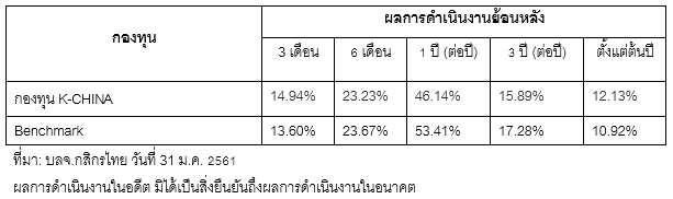 ด้านผลการดำเนินงานย้อนหลังของกองทุน K-CHINA ณ วันที่ 31 ม.ค. 2561 นับตั้งแต่ต้นปีให้ผลตอบแทนอยู่ที่ 12.13% เอาชนะเกณฑ์มาตรฐานซึ่งอยู่ที่ 10.92%, ผลการดำเนินงานย้อนหลัง 6 เดือน ให้ผลตอบแทนที่ 23.23% ขณะที่เกณฑ์มาตรฐานอยู่ที่ 23.67% ผลการดำเนินงานย้อนหลัง 1 ปี ให้ผลตอบแทนที่ 46.14% ต่อปี ขณะที่เกณฑ์มาตรฐานอยู่ที่ 53.41% ต่อปี และผลการดำเนินงานย้อนหลัง 3 ปี ให้ผลตอบแทนที่ 15.89% ต่อปี ขณะที่เกณฑ์มาตรฐานอยู่ที่ 17.28%ต่อปี นอกจากนี้กองทุน K-CHINA ยังได้รับการจัดอันดับเรตติ้ง 5 ดาวจากมอร์นิ่งสตาร์ (Morningstar® Overall Rating ของกลุ่ม Thailand OE China Equity, ข้อมูล ณ 31 ม.ค. 2561)