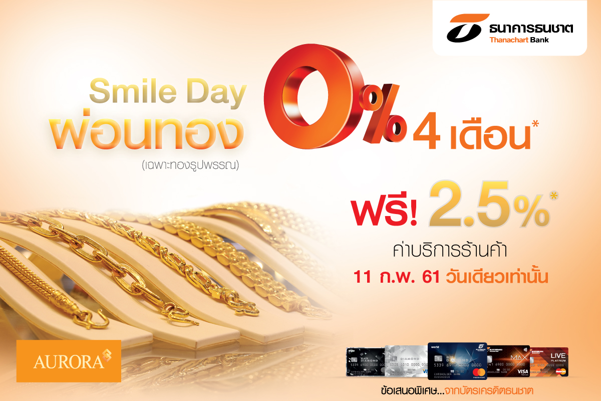 9 กุมภาพันธ์ 2561 : ธนาคารธนชาต จำกัด (มหาชน) และ ห้างเพชรทอง ออโรร่า หวนจัดโปรโมชั่นแรงร่วมกันอี กครั้งเพื่อรองรับการจับจ่ายซื้ อทองคำในช่วงเทศกาลตรุษจีน มอบความพิเศษสุดให้ลูกค้าบั ตรเครดิตธนชาตและบัตรสินเชื่อบุ คคลธนชาต (FLASH Plus) ผ่อนทองคำรูปพรรณ 0% นาน 4 เดือน พร้อมฟรีค่าบริการร้านค้า 2.5% ที่ห้างเพชรทองออโรร่า ทุกสาขาทั่วประเทศ วันที่ 11 ก.พ.2561 เพียงวันเดียวเท่านั้น!