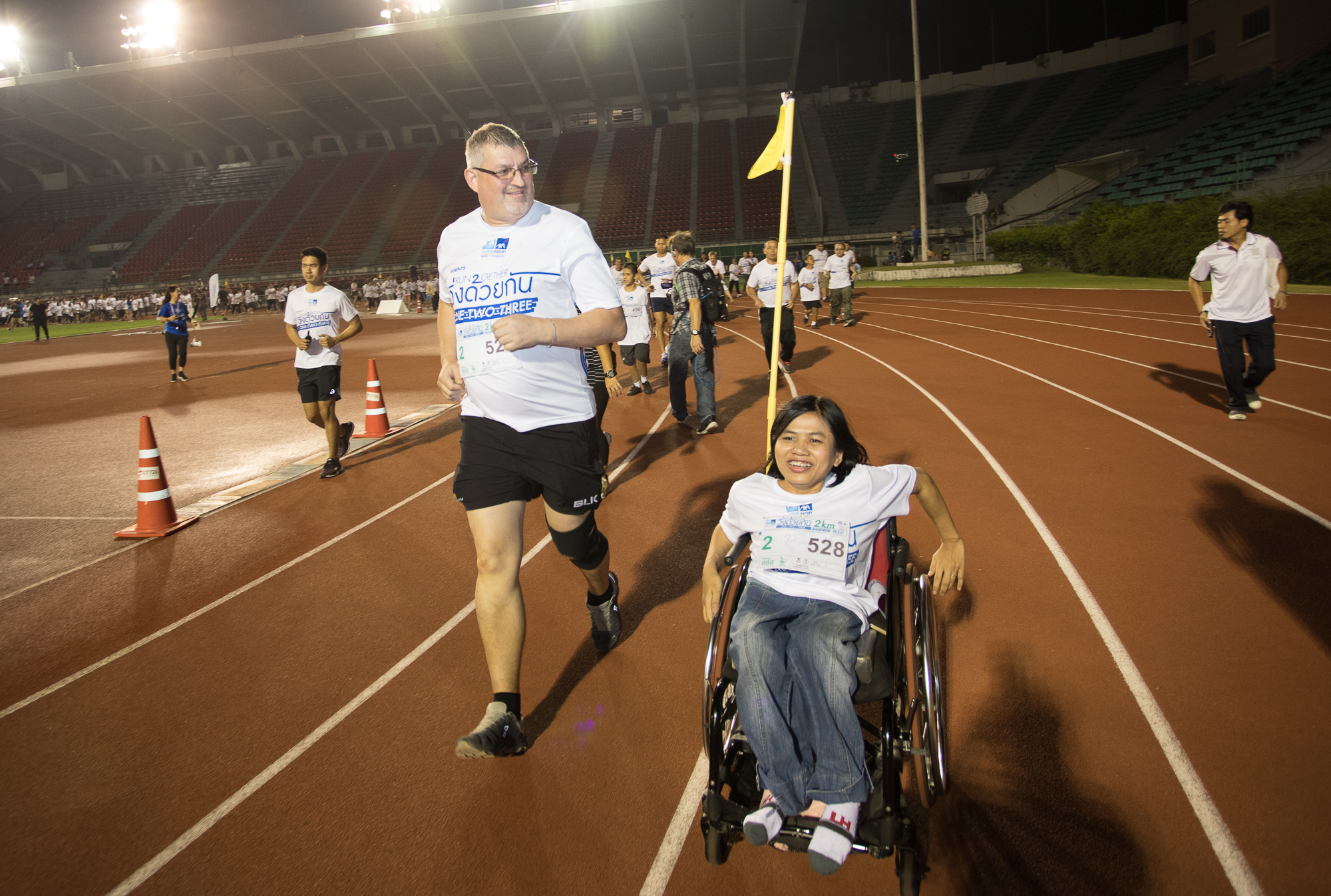 กิจกรรม “วิ่งด้วยกัน Run2gether” เป็นกิจกรรมมินิมาราธอนที่จับคู่วิ่งร่วมกันระหว่างคนพิการ และคนทั่วไปที่เป็นไกด์ รันเนอร์ เพื่อมุ่งเน้นการสร้างความเท่าเทียมกันในสังคม ในระยะ 2 กิโลเมตร 6 กิโลเมตร และ 10 กิโลเมตร ณ สนามกีฬาแห่งชาติศุภชลาสัย โดยมีผู้เข้าร่วมงานวิ่งมินิมาราธอนครั้งนี้กว่า 1,800 คน ![]()