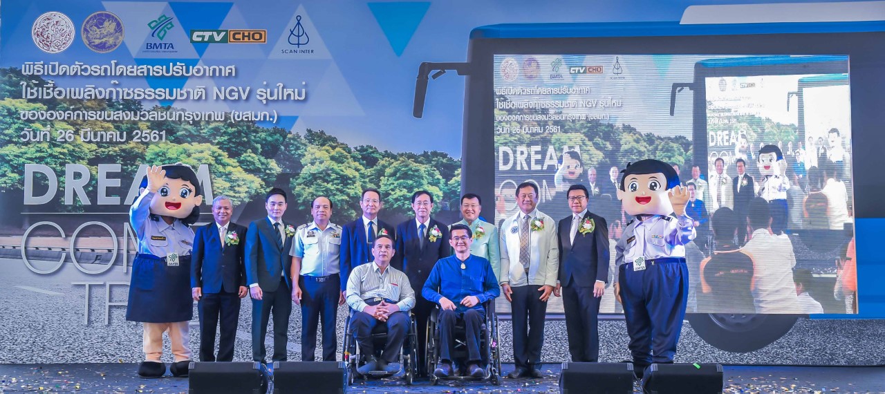 27 มีนาคม 2561 : ดร.ฤทธี กิจพิพิธ (ที่ 2 จากซ้าย) กรรมการผู้จัดการใหญ่ บมจ. สแกน อินเตอร์ หรือ SCN และ สุรเดช ทวีแสงสกุลไทย (ขวาสุด) กรรมการผู้จัดการใหญ่และประธานเจ้าหน้าที่บริหาร บมจ. ช ทวี หรือ CHO ภายใต้กลุ่มร่วมทำงาน SCN-CHO ร่วมงานแถลงข่าวเปิดตัวรถโดยสารปรับอากาศใช้เชื้อเพลิงก๊าซธรรมชาติ NGV รุ่นใหม่ของ ขสมก. หลังได้ส่งมอบรถ ลอตแรกจำนวน 100 คันให้แก่ ขสมก. ได้ตามกำหนด เพื่อวิ่งอออกให้บริการแก่ประชาชนในบางเส้นทางเป็นที่เรียบร้อยแล้ว