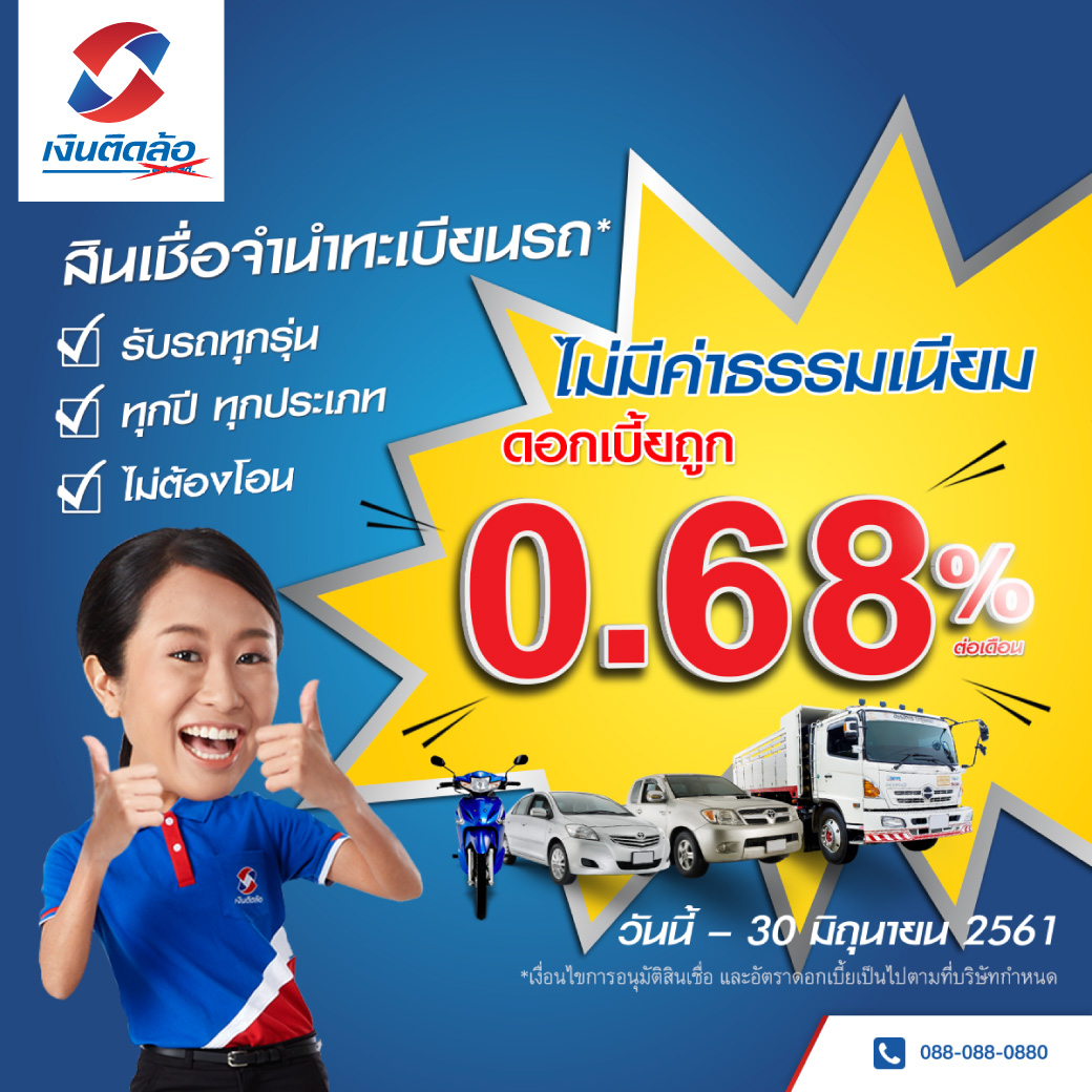 บริษัทฯ เล็งเห็นถึงความสำคัญของการลดภาระทางการเงินให้กับลูกค้ากลุ่มผู้มีรายได้น้อยหรือผู้ประกอบอาชีพอิสระ จึงเปิดตัวแคมเปญดอกเบี้ยพิเศษ 0.68% ต่อเดือน โดยไม่มีค่าธรรมเนียม สำหรับลูกค้าสินเชื่อทะเบียนรถยนต์ทุกรุ่น ทุกปี ทุกประเภท แบบไม่โอนเล่ม ที่เข้ามาติดต่อขอสินเชื่อที่เงินติดล้อทุกสาขาทั่วประเทศ ในระหว่างวันที่ 28 มีนาคม ถึง 30 มิถุนายน 2561