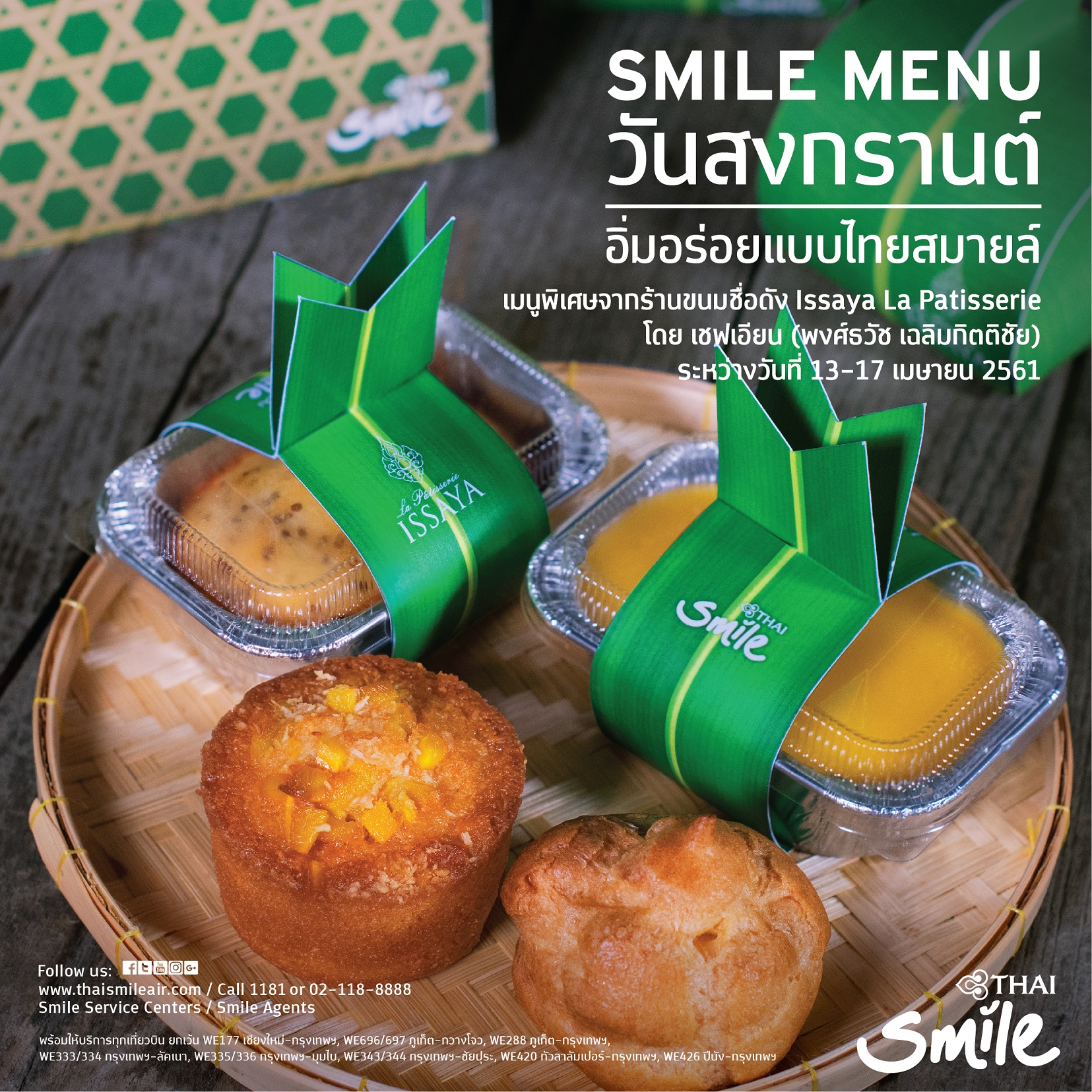 3 เมษายน 2561 : สายการบินไทยสมายล์ขอร่วมฉลองเทศกาลสงกรานต์ปี 2561 เติมเต็มรอยยิ้มผู้โดยสารในทุกเที่ยวบิน ด้วยเมนูขนมไทยฟิวชั่นสุดพิเศษ จากร้าน Issaya La Patisserie บริหารงานโดยเชฟ เอียน พงศ์ธวัช เฉลิมกิตติชัย ซึ่งรังสรรค์เมนูขนมไทยฟิวชั่นที่ผสมผสานระหว่างขนมไทยและขนมตะวันตกได้อย่างลงตัว รวม 4 เมนู ได้แก่ มัฟฟินบ้าบิ่นมะม่วง Mango Financier ขนมจากประเทศฝรั่งเศสโรยหน้าด้วยมะม่วงและมะพร้าวผลไม้ที่เป็นส่วนผสมส่วนใหญ่ของขนมไทย ชูครีมมะม่วง Chuax cream mango ชูครีมสอดใส้มะม่วงหอมหวานกลมกล่อม