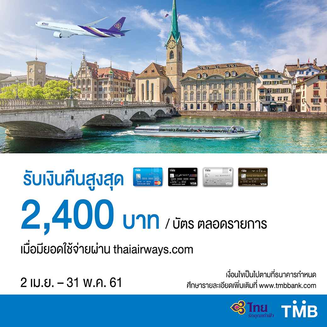 17 เมษายน 2561 : บัตรเครดิต TMB ให้คุณบินทั่วโลก ในความสบายที่ต่างกัน พร้อมมอบเครดิตเงินคืน 1,200 บาท เมื่อชำระค่าบัตรโดยสารและบริการผ่านบัตรเครดิต TMB ตั้งแต่ 15,000 บาทขึ้นไป / ครั้ง ผ่านเว็บไซต์ thaiairways.com (จำกัดสูงสุด 2 สิทธิ์ / บัตร ตลอดรายการ หรือ 2,400 บาท ตลอดรายการ) ลงทะเบียนรับสิทธิ์พิมพ์ TMBTG ตามด้วยหมายเลขบัตรเครดิต 12 หลักสุดท้าย ส่งมาที่ 4806026 ระหว่างวันที่ 2 เมษายน – 31 พฤษภาคม 2561 สอบถามรายละเอียดเพิ่มเติมที่ TMB Contact Center โทร. 1558 หรือ www.tmbbank.com/promotion ![]()