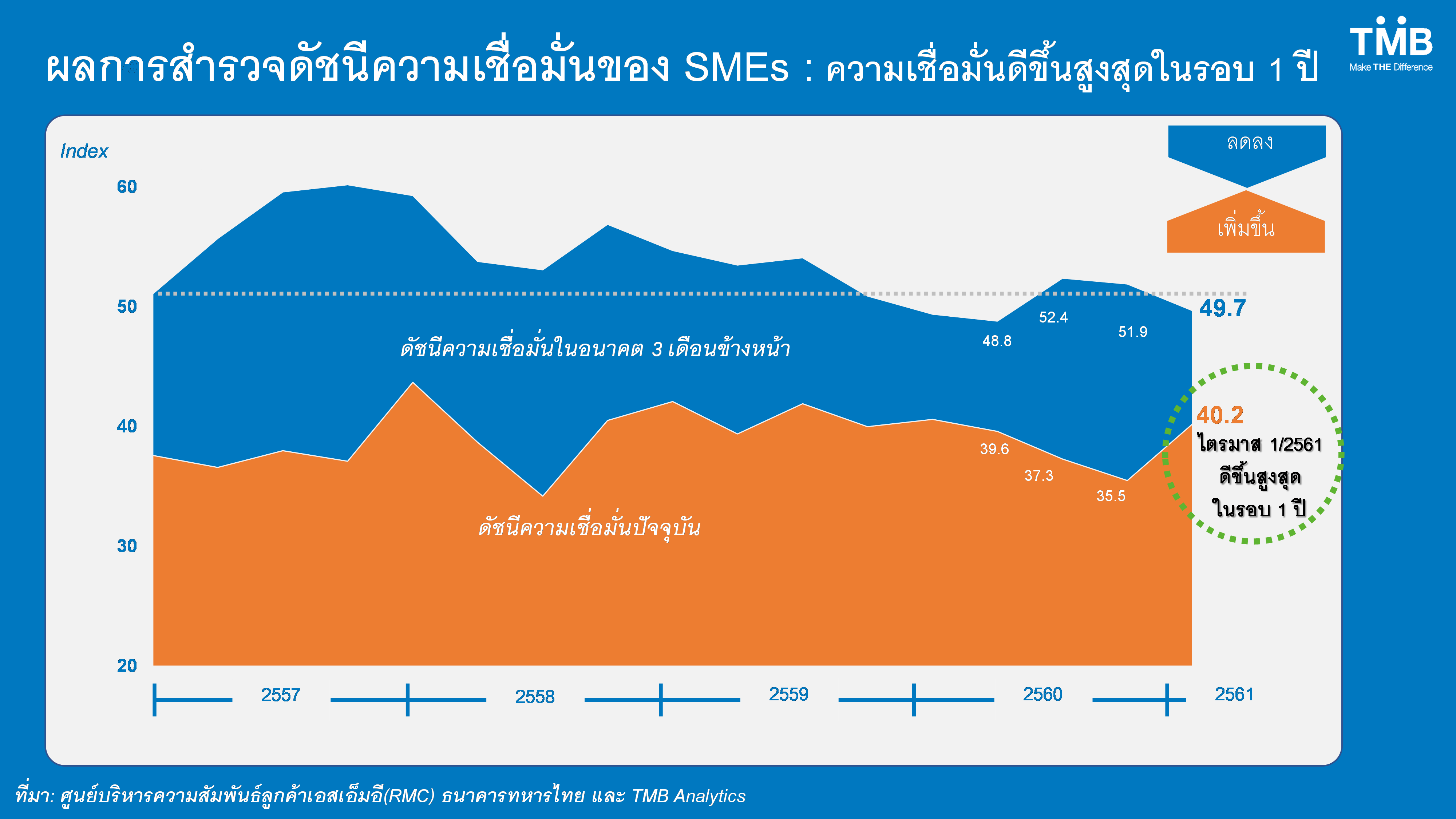 27 เมษายน 2561 : ศูนย์วิเคราะห์เศรษฐกิจ ทีเอ็มบี หรือ TMB Analytics เปิดเผย “ดัชนีความเชื่อมั่นผู้ประกอบการขนาดย่อม-ทีเอ็มบี” (TMB-SME Sentiment Index) ไตรมาส 1/2561 จากความเห็นของผู้ประกอบการ SME กว่า 1,268 รายทั่วประเทศ สำรวจโดยศูนย์บริหารความสัมพันธ์ลูกค้าเอสเอ็มอี (RMC) ทีเอ็มบี พบว่า ดัชนีความเชื่อมั่นปัจจุบันของผู้ประกอบการเพิ่มขึ้นสูงสุดในรอบ 1 ปีมาอยู่ที่ระดับ 40.2 เพิ่มขึ้นจากระดับ 35.5