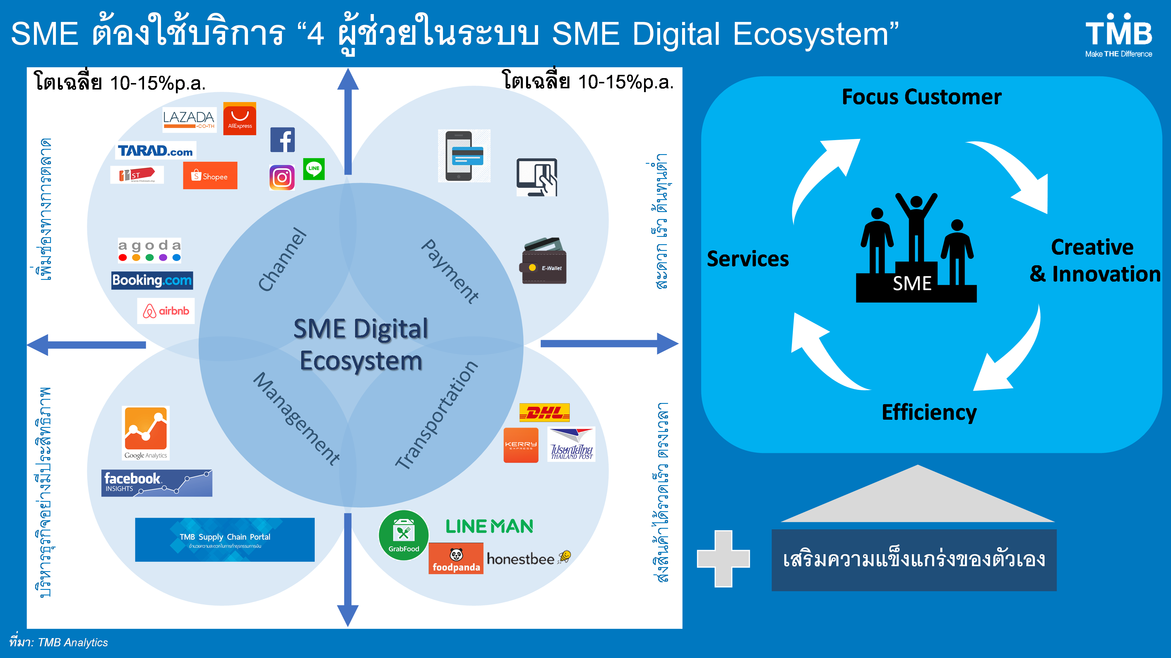 อย่างไรก็ตาม ศูนย์วิเคราะห์เศรษฐกิจ TMB มองว่า ในภาวะเศรษฐกิจที่ดีขึ้น SME ได้รับอานิสงส์จากกำลังซื้อที่กลับมาช่วยการดำเนินธุรกิจได้ในระดับหนึ่ง แต่พฤติกรรมผู้บริโภคเปลี่ยนแปลงหันไปใช้ช่องทางดิจิทัลมากขึ้น ธุรกิจมีความจำเป็นที่จะต้องขยายการดำเนินธุรกิจไปสู่โลกยุคดิจิทัล เพื่อสร้างตลาดใหม่ๆ เพื่อให้ได้รับอานิสงส์อย่างเต็มที่จากการฟื้นตัวทางเศรษฐกิจ ![]()