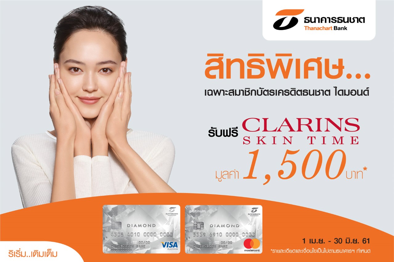 2 พฤษภาคม 2561 : ธนาคารธนชาต จำกัด (มหาชน) มอบสิทธิพิเศษให้กับสมาชิก บัตรเครดิตธนชาต DIAMOND รับฟรี! CLARINS SKIN TIME มูลค่า 1,500 บาท รับบริการตรวจเช็คและวิเคราะห์ผิว พร้อมทรีตเมนท์บำรุงผิวหน้าตามปัญหาผิว 15 นาที และเรียนรู้เทคนิคการดูแลผิวสวย สุขภาพดีสไตล์คลาแรงส์ รวมทั้งรับผลิตภัณฑ์ขนาดทดลอง 3 ชิ้น (ตามสภาพผิว)