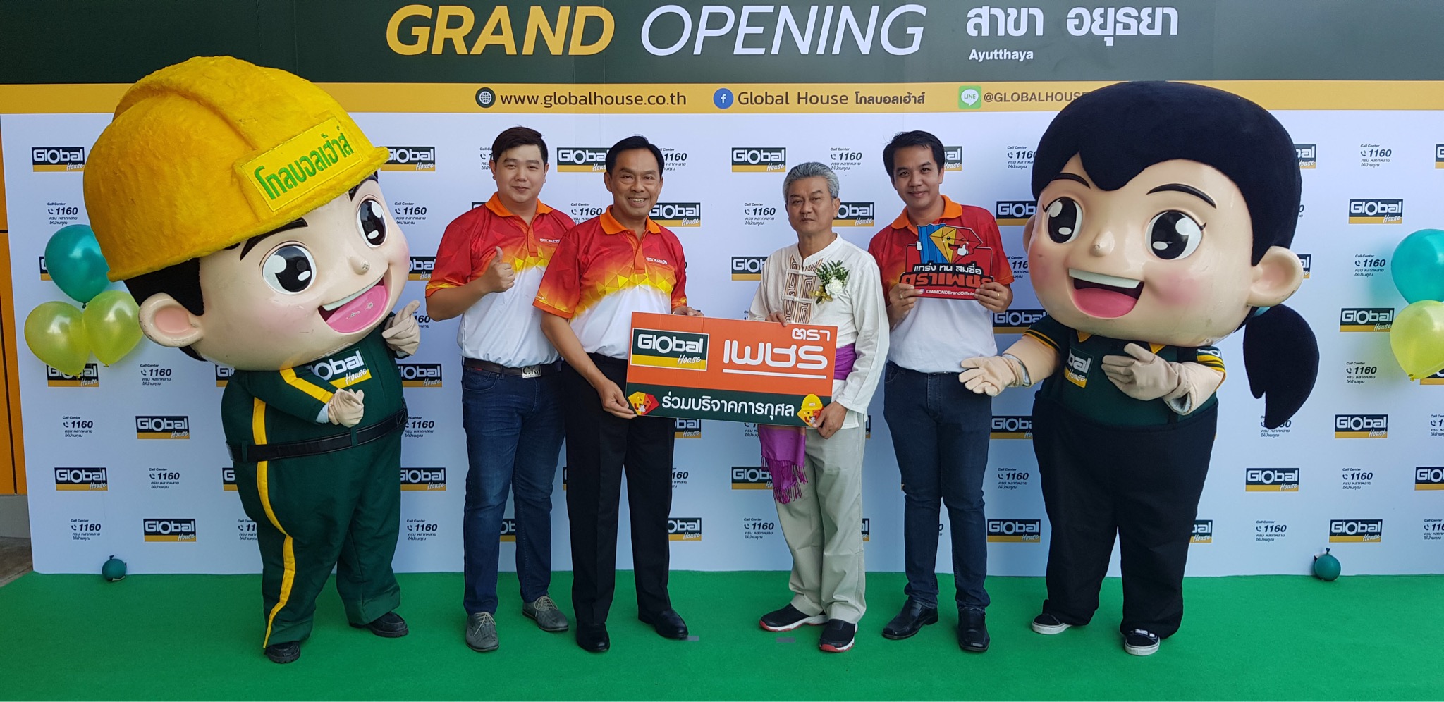 28 พฤษภาคม 2561 : นายสาธิต สุดบรรทัด (ที่ 2 จากซ้าย) ประธานเจ้าหน้าที่บริหาร บริษัท ผลิตภัณฑ์ตราเพชร จำกัด (มหาชน) หรือ DRT และคณะผู้บริหาร ร่วมแสดงความยินดีกับ นายอนวัช สุริยวนากุล (ที่ 3 จากซ้าย) ประธานคณะกรรมการบริหารและประธานเจ้าหน้าที่บริหาร บริษัท สยามโกลบอลเฮ้าส์ จำกัด (มหาชน) ผู้บริหารศูนย์จำหน่ายวัสดุอุปกรณ์ก่อสร้างและตกแต่งบ้านครบวงจรภายใต้ชื่อ ‘โกลบอลเฮ้าส์’ พร้อมร่วมบริจาคเพื่อการกุศล เนื่องในโอกาสที่เปิดให้บริการโกลบอลเฮ้าส์สาขาใหม่ที่จังหวัดพระนครศรีอยุธยาอย่างเป็นทางการ เพื่อขยายฐานลูกค้าในพื้นที่และจังหวัดใกล้เคียง ![]()