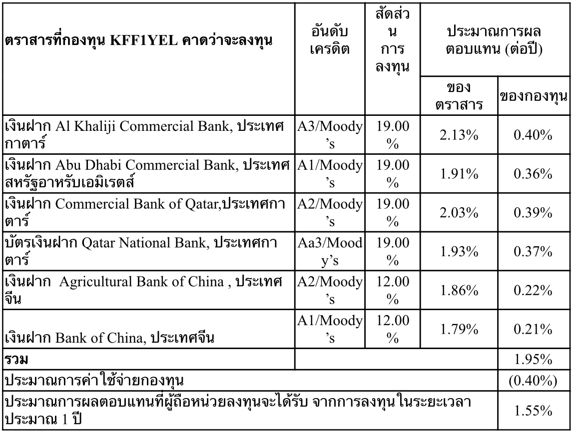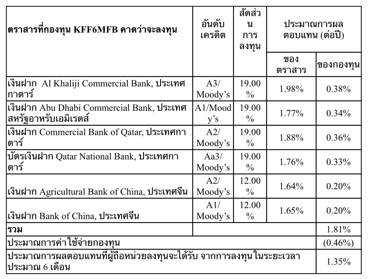 รวมถึงจะลงทุนในเงินฝาก Agricultural Bank of China และเงินฝาก Bank of China, ประเทศจีน นอกจากนี้ยังคาดว่าจะลงทุนในเงินฝาก Abu Dhabi Commercial Bank, ประเทศสหรัฐอาหรับเอมิเรตส์ โดยทั้ง 2 กองทุนดังกล่าวมีนโยบายป้องกันความเสี่ยงจากอัตราแลกเปลี่ยนเต็มจำนวน และผู้ลงทุนสามารถลงทุนด้วยเงินขั้นต่ำเพียง 500 บาท