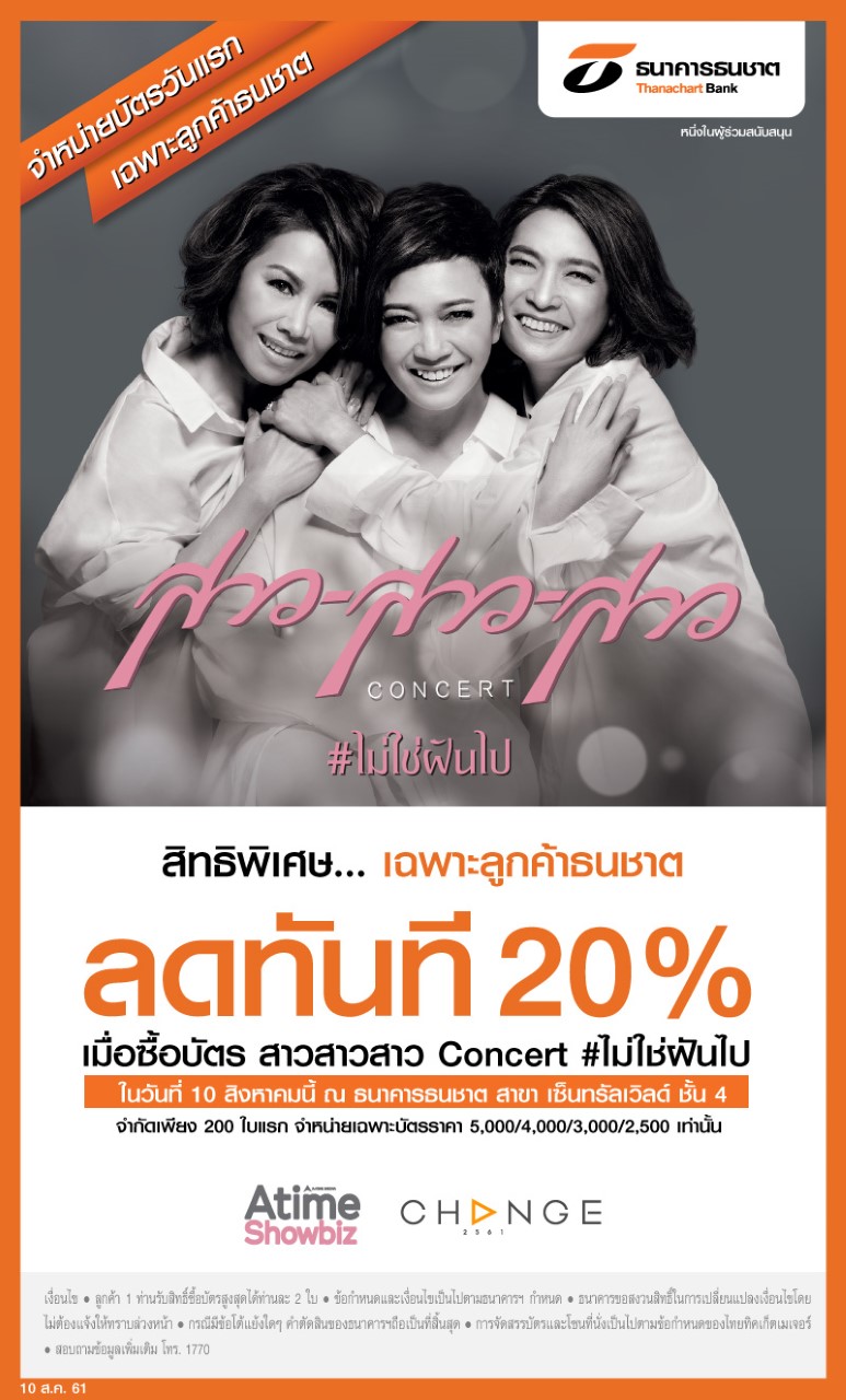 7 สิงหาคม 2561 : ธนาคารธนชาต จำกัด (มหาชน) มอบสิทธิพิเศษสำหรับลูกค้าที่ใช้ผลิตภัณฑ์และบริการของ ธนชาต ได้แก่ ลูกค้าสินเชื่อรถยนต์, สินเชื่อบ้าน, เงินฝาก, บัตรเครดิต, SMEs, ลูกค้าหลักทรัพย์ธนชาต, ลูกค้า บลจ.ธนชาต, ลูกค้าประกันภัยธนชาต รับส่วนลดทันที 20% เมื่อซื้อบัตรชมคอนเสิร์ต “สาว สาว สาว” #ไม่ใช่ฝันไป (จำกัดเพียง 200 ใบแรก) โดยเปิดจองในวันศุกร์ที่ 10 สิงหาคม 2561 ตั้งแต่เวลา 10.00 น. – 17.00 น. ณ ธนาคารธนชาต สาขาเซ็นทรัลเวิลด์ ชั้น 4 โดยลูกค้านำหลักฐานการใช้ผลิตภัณฑ์และบริการพร้อมบัตรประชาชนมาแสดงเพื่อรับสิทธิ์ ณ สาขา ตามวันและเวลาดังกล่าว ลูกค้า 1 ท่านสามารถซื้อได้ไม่เกินท่านละ 2 ใบ ![]()