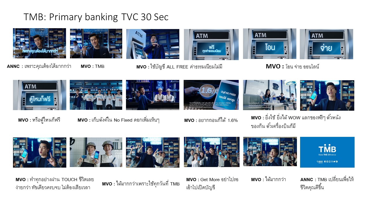 โดยใช้เวลาเล่าทั้งหมดเพียง 30 วินาทีเท่านั้น เพื่อตอกย้ำแนวคิดใหม่ “บัญชีเดียวที่ให้คุณได้มากกว่าใคร” Everyday Everyone Get MORE with TMB” หวังเชิญชวนให้ผู้ใช้งานปัจจุบันและลูกค้ารายใหม่ที่สนใจบริการการเงินที่ให้ประโยชน์มากกว่า เข้ามาศึกษาและสมัครใช้บริการของทีเอ็มบีในวันนี้เพื่อให้ตัวเอง “ได้มากกว่า”