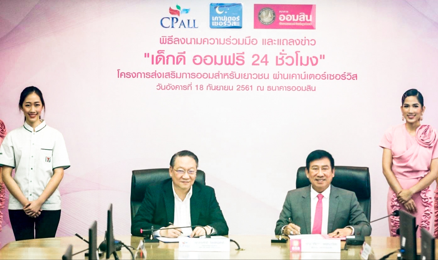 ความร่วมมือระหว่าง ธนาคารออมสิน ร่วมกับ บริษัท ซีพี ออลล์ จำกัด (มหาชน) และบริษัท เคาน์เตอร์เซอร์วิส จำกัด ในครั้งนี้ เพื่อร่วมกันจัดทำโครงการเพื่อสังคม คือ โครงการส่งเสริมการออมสำหรับเยาวชน “เด็กดี ออมฟรี 24 ชั่วโมง” ผ่านเคาน์เตอร์เซอร์วิสถือเป็นการเพิ่มความสะดวกสบายและช่องทางการออมได้มากยิ่งขึ้น